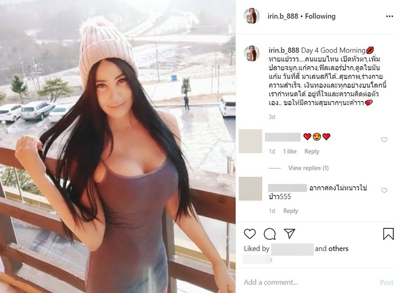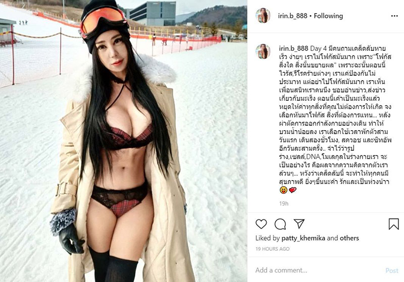 นอกจากนี้ เปิ้ล ไอริณ ยังได้โพสต์ภาพตัวเองขณะเล่นสกี พร้อมแคปชั่นว่า "ฝากดาราหน้าใหม่ ไว้ในอ้อมใจได้ม้ายคะ" ก่อนลงภาพสุดหวิวท้าอากาศหนาวกลางหิมะ และเผยเคล็ดลับหายเร็วแบบง่าย ๆ ว่า "เราไม่โฟกัสมันมาก เพราะ "โฟกัสสิ่งใด สิ่งนั้นขยายผล" เพราะฉะนั้นตอนนี้ไวรัส, หรือโรคร้ายต่าง ๆ เราแค่ป้องกันไม่ประมาท แต่อย่าไปโฟกัสมันมาก โดยหลังผ่าตัดตนก็ออกกำลังกาย ทำให้บวมน้ำน้อยลง