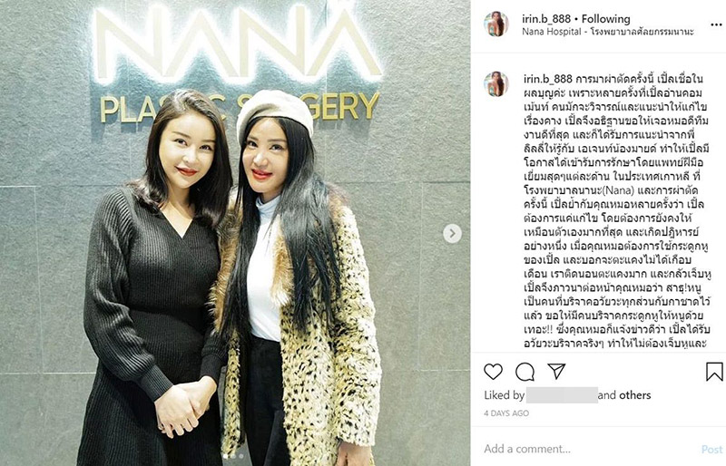ออกมาเปิดเผยแบบไม่มีปิดบัง ว่าได้ไปทำศัลยกรรมอัปหน้าใหม่ สำหรับสาว เปิ้ล ไอริณ ซึ่งเจ้าตัวได้เปิดใจว่า "การมาผ่าตัดครั้งนี้ เปิ้ลเชื่อในผลบุญค่ะ เพราะหลายครั้งที่เปิ้ลอ่านคอมเมนต์ คนมักจะวิจารณ์และแนะนำให้แก้ไขเรื่องคาง เปิ้ลจึงอธิษฐานขอให้เจอหมอดีทีมงานดีที่สุด" จนกระทั่งได้เจอเอเจนต์และทีมงานที่ถูกใจ กับแพทย์ฝีมือเยี่ยมที่เกาหลีใต้ โดยย้ำกับคุณหมอว่า ต้องการแค่แก้ไข โดยยังคงให้เหมือนตัวเองที่สุด