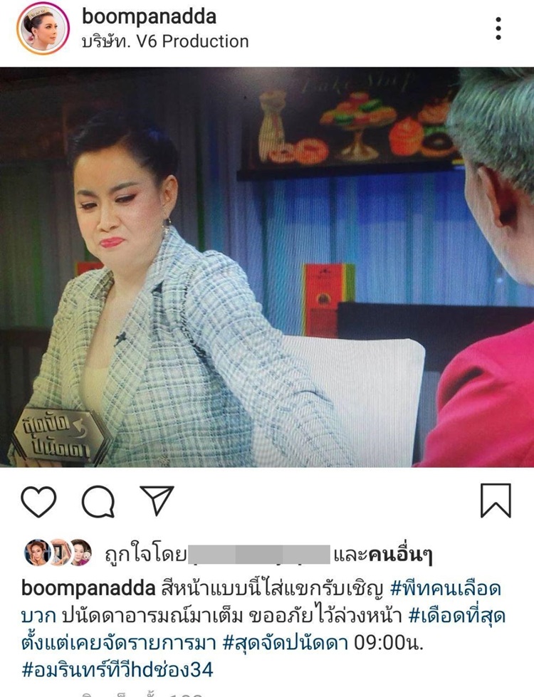 ด้าน บุ๋ม ปนัดดา ก็ได้ออกมาเคลื่อนไหวเกี่ยวกับเรื่องนี้เช่นกัน โดยได้โพสต์ภาพจากรายการ ตอนที่สัมภาษณ์ พีท คนเลือดบวก แล้วมีจังหวะที่เจ้าตัวเบะปากแรง พร้อมขออภัยว่า "สีหน้าแบบนี้ใส่แขกรับเชิญ #พีทคนเลือดบวก ปนัดดาอารมณ์มาเต็ม ขออภัยไว้ล่วงหน้า #เดือดที่สุดตั้งแต่เคยจัดรายการมา #สุดจัดปนัดดา 09:00น. #อมรินทร์ทีวีhdช่อง34"