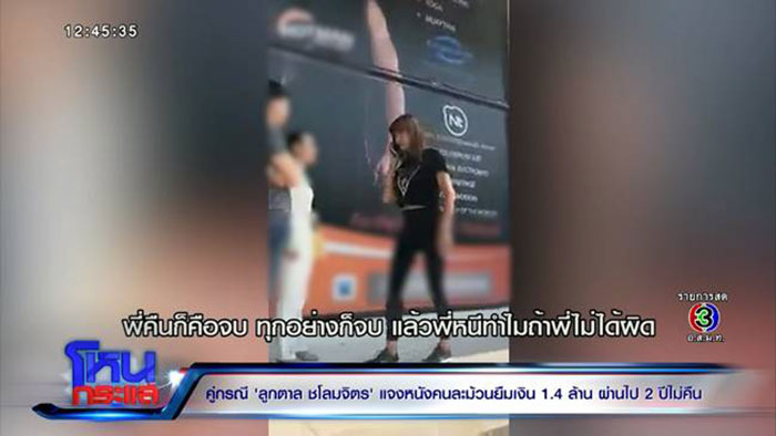 ตอนคุณมายืมเงิน คุณไม่เอาทนายความมา แต่พอจะคืนเงิน กลับพูดถึงทนายความ ตนเป็นคนค้าเพชร ไม่ใช่ค้าความ ตนต้องเอาเวลาไปทำมาหากิน เฉพาะดอกเบี้ยที่ต้องจ่ายแทนทุกเดือนก็มากพออยู่แล้ว สิ่งที่ตนต้องการคือเงินสด 1.4 ล้าน แล้วเอาเพชรที่เป็นหลักประกันคืนไป หรือจะคุยกันและประนอมหนี้ ตนก็ไม่ว่า เรื่องลูกตาลไปบอกกับสื่อว่าตนยึดรถลูกตาล ก็ไม่จริงอีก ลูกตาลบอกว่าคุณจุ๋มมีบุญคุณ แต่วันนั้นจะตบตน มันคืออะไร ?