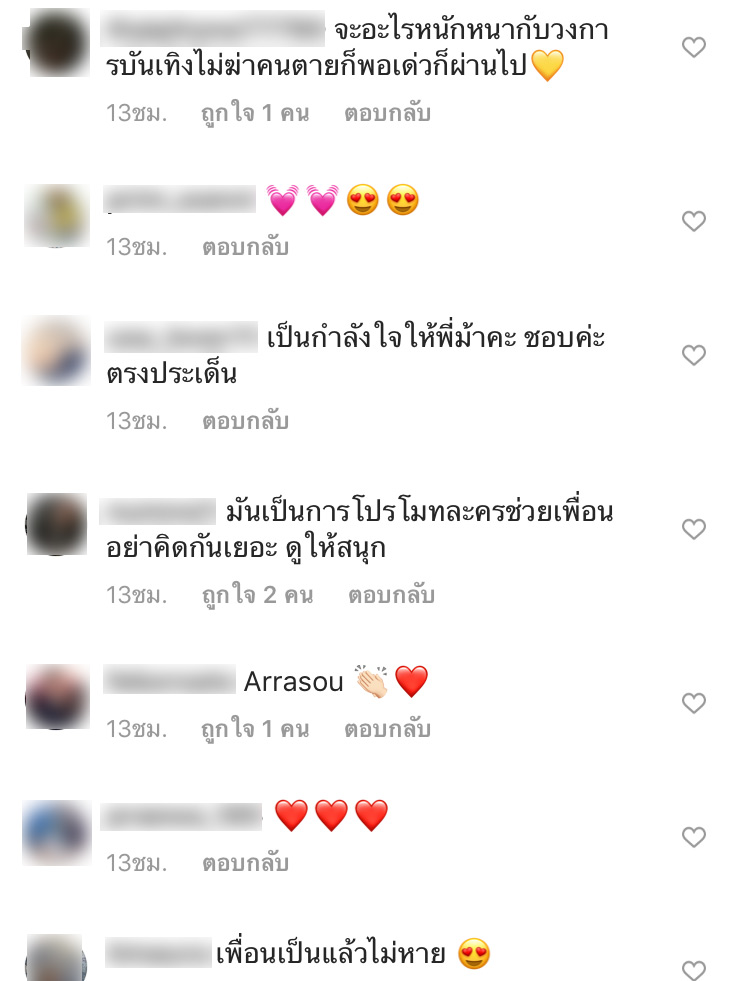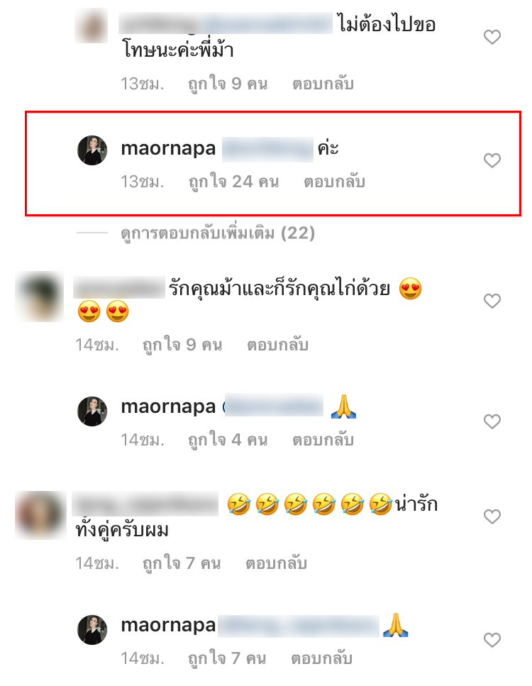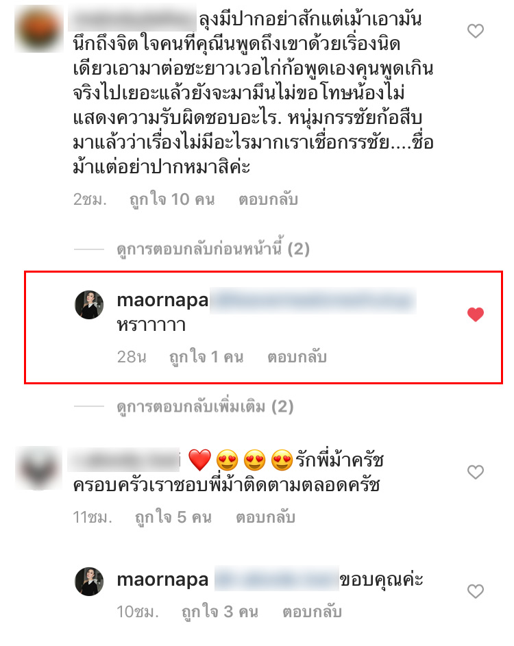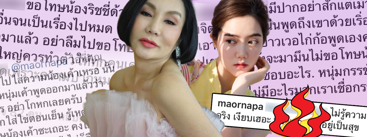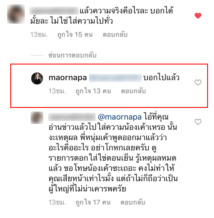 รวมถึงมีคนมาบอกให้ไปขอโทษริชชี่ด้วย ตีข่าวใส่ร้ายคนอื่นไปหมด เป็นผู้ใหญ่ควรทำตัวให้คนเคารพ ไม่ใช่ให้เกลียดเพราะความปากหมาของคุณ ก่อนที่ ม้า อรนภา จะเข้ามาตอบว่า "ขอโทษเรื่องอะไร" พร้อมกับบอกว่า "ไม่รู้ความจริง เงียบเหอะ น้องเขาจะได้อยู่เป็นสุข" นอกจากนี้ยังมีคนเข้ามาคอมเมนต์ให้กำลังใจจำนวนมาก บ้างก็มองว่านี่คือวงการบันเทิง และนี่คือการโปรโมตละคร