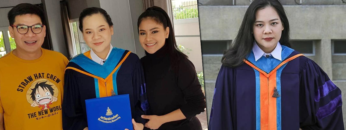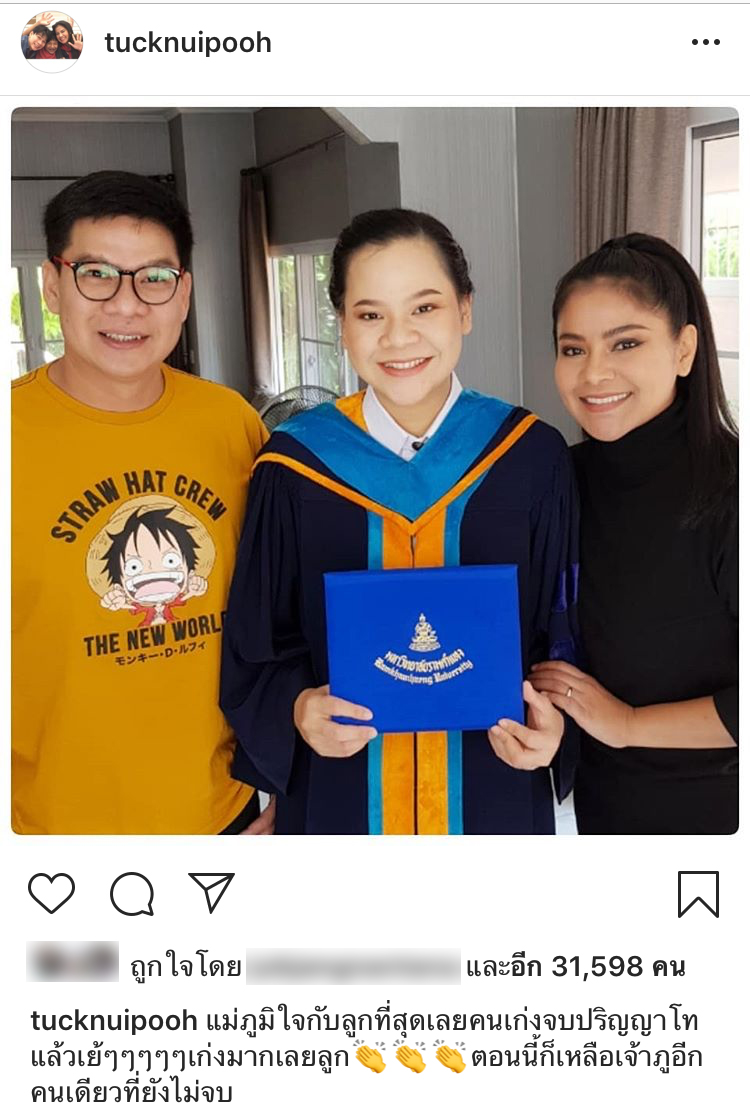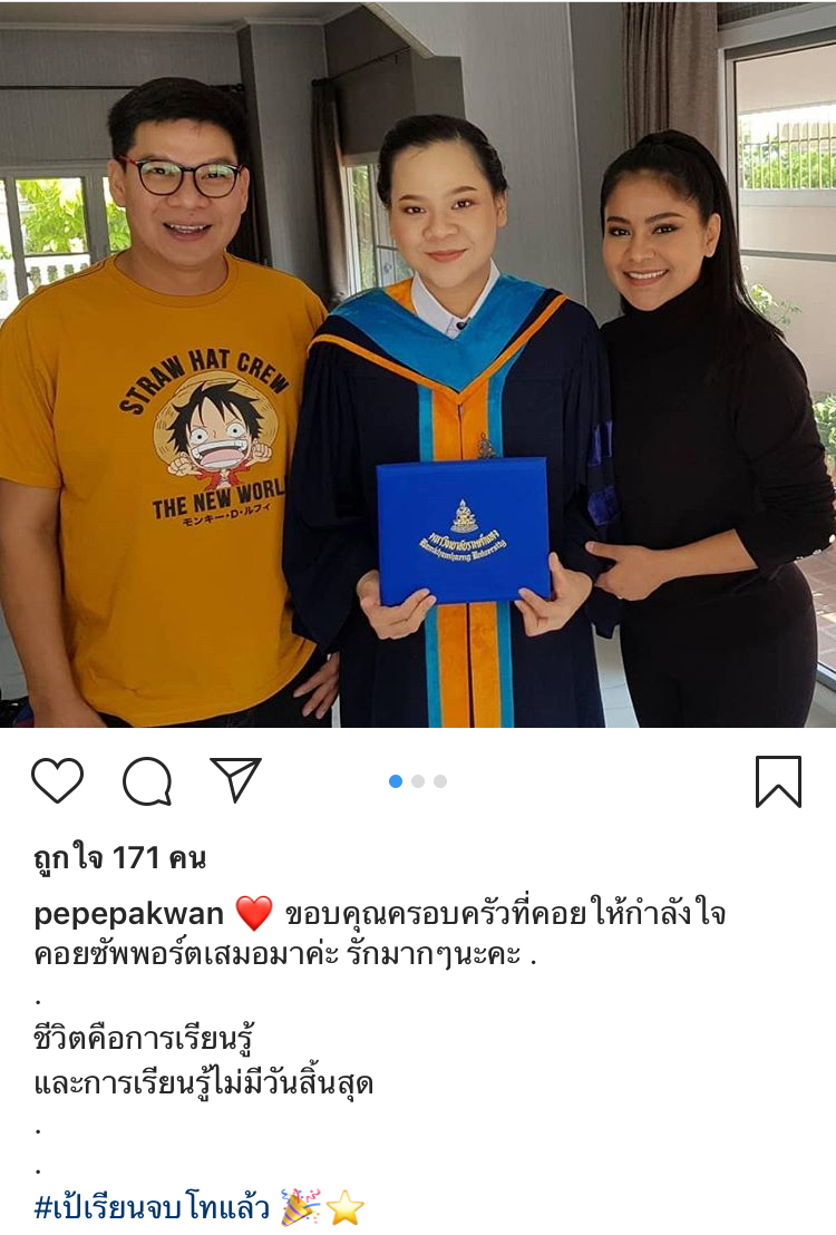 ขณะที่ น้องเป้ ก็โพสต์รูป พร้อมขอบคุณทั้งพ่อนุ้ยและแม่ตั๊กที่คอยเป็นกำลังใจให้เสมอมา "ขอบคุณครอบครัวที่คอยให้กำลังใจ คอยซัพพอร์ตเสมอมาค่ะ รักมาก ๆ นะคะ ชีวิตคือการเรียนรู้และการเรียนรู้ไม่มีวันสิ้นสุด #เป้เรียนจบโทแล้ว"