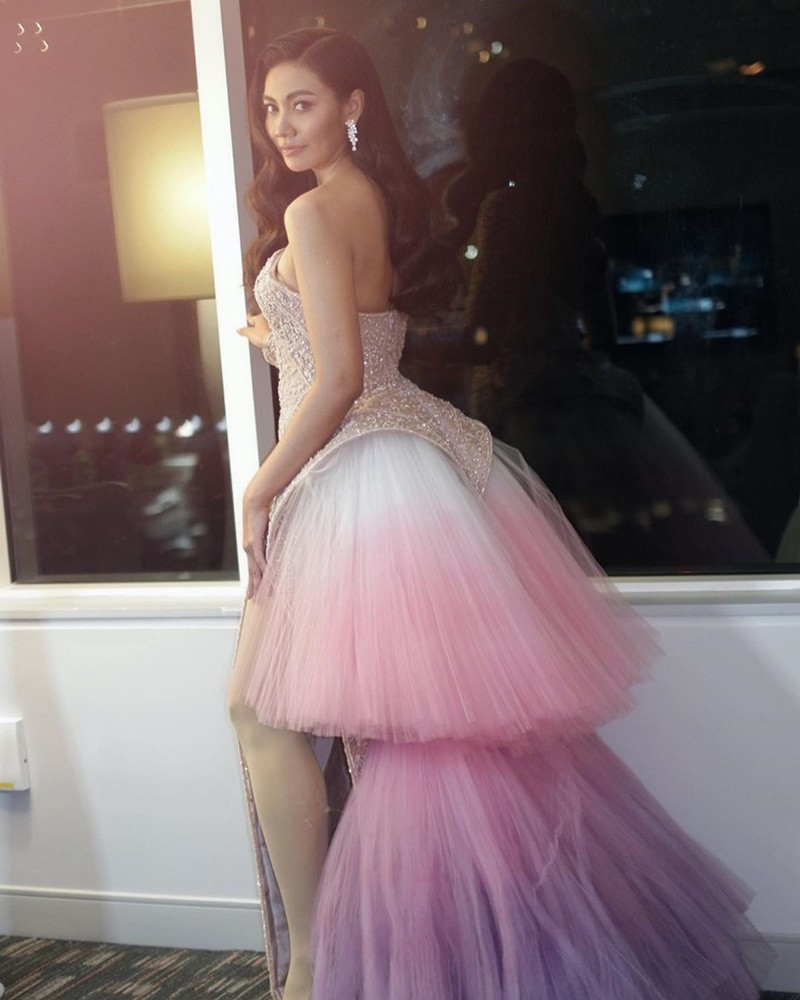 เริ่มจากชุดแรก Ball Gown Ombre ชุดเปิดไหล่กระโปรงยาวฟูฟ่อง ไล่ระดับสีสวยงาม สุดอลังการจากแบรนด์ POEM ซึ่งเป็นแบรนด์ฝีมือคนไทยที่เหล่าดารา เซเลบ นิยมใส่กันเยอะมาก โดยคุณฌอน ชวนล ไคสิริ เป็นดีไซเนอร์และเจ้าของแบรนด์ ซึ่งชุดนี้แก้มใส่แล้ว สวยสง่า อย่างกับเอลซ่าทะลุเฟรมออกมาจริง ๆ