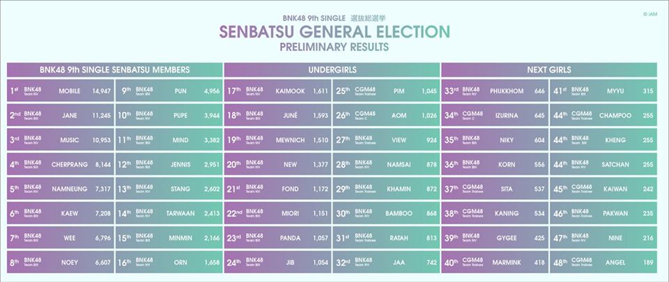 ประกาศผลเป็นที่เรียบร้อยแล้วสำหรับ BNK48 9th Single Senbatsu General Election ที่เปิดให้แฟน ๆ ได้โหวตเพื่อให้สมาชิกที่ตัวเองชื่นชอบได้ติดเป็นเซ็นบัตสึ (สมาชิกตัวจริง) ในซิงเกิลต่อไปของวง