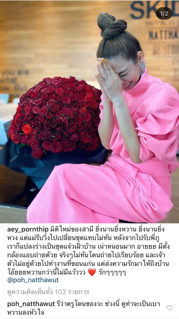 ต่อมา เอ๋ พรทิพย์ รีบไปเปลี่ยนชุดสวยจัดเต็ม สีชมพูหวาน ๆ รับวาเลนไทน์ พร้อมขอบคุณในความน่ารักของสามีที่นับวันยิ่งหวานขึ้นเรื่อย ๆ "มิติใหม่ของสามี ยิ่งนานยิ่งหวาน ยิ่งนานยิ่งหวง แต่แม่รีบวิ่งไปเปลี่ยนชุดแทบไม่ทัน หลังจากไปรับพี่ภู เราก็แปลงร่างเป็นชุดแจ๋วเฝ้าบ้าน เน่าหนอนมาก อาย มีตั้งกล้องแอบถ่ายด้วย จริง ๆ เปลี่ยนไม่ทัน โดนถ่ายไปเรียบร้อย และเจ้าตัวไม่อยู่ด้วยไปทำงานที่ขอนแก่น แต่ส่งความรักมาให้ถึงบ้าน โอ๊ยยย หวานกว่านี้ไม่มีแว้ววว รัก ๆ ๆ ๆ ๆ ๆ @poh_natthawut"