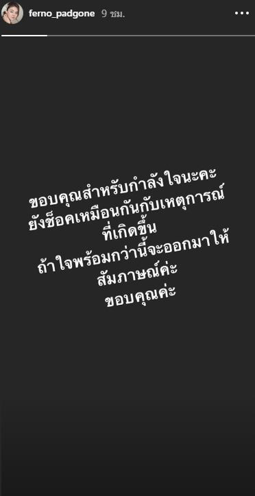 ส่วน ใบเฟิร์น พัสกร เมื่อมีกระแสข่าวดราม่าดังกล่าว ก็ไม่ได้ลบรูปที่เปิดตัวเจโม่แต่อย่างใด แต่มีความเคลื่อนไหวแล้ว โดยลงไอจีสตอรี่ ระบุว่า "ขอบคุณสำหรับกำลังใจนะคะ ยังช็อกเหมือนกันกับเหตุการณ์ที่เกิดขึ้น ถ้าใจพร้อมกว่านี้จะออกมาให้สัมภาษณ์ค่ะ ขอบคุณค่ะ"