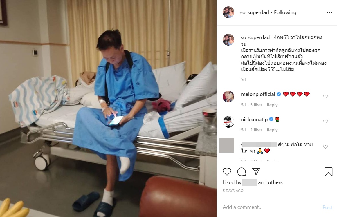 โดยก่อนหน้านี้ เมื่อวันที่ 14 กุมภาพันธ์ คุณพ่อโส ได้โพสต์ภาพขณะอยู่ในชุดผู้ป่วยที่โรงพยาบาล พร้อมอัปเดตหลังการผ่าตัดว่า "14 ก.พ. 63 จาไปสอบจอหงวน เมื่อวานรับการผ่าตัดลูกอัณฑะไปสองลูกกลายเป็นขันทีไปเรียบร้อยแล้ว ต่อไปนี้ต้องไปสอบจอหงวนเผื่อจะได้ครองเมืองสักเมือง 555....ไม่มีรัย"