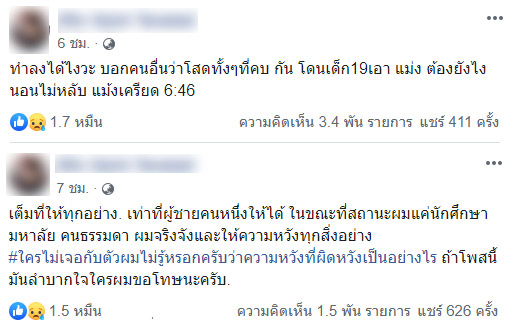 วันที่ 21 กุมภาพันธ์ 2563 หนุ่มรายหนึ่งโพสต์ระบายผ่านเฟซบุ๊ก หลังจับได้ว่าแฟนสาวที่คบกันมานั้นแอบมีผู้ชายคนอื่น ซึ่งไม่ใช่แค่การแอบคุยกันเท่านั้น แต่ลึกซึ้งถึงขั้นมีอะไรกันแล้ว โดยมีบางอย่างทำให้หนุ่มรายนี้สงสัยแฟนสาว กระทั่งทนกับความสงสัยไม่ไหว เลยค้นขยะจนเจอถุงยางอนามัยใช้แล้ว ทำเขาถึงกับหลั่งน้ำตาลูกผู้ชายเลยทีเดียว