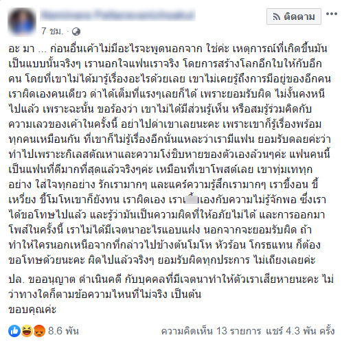 โดยมีคลิปในเหตุการณ์ด้วย ซึ่งผู้หญิงคนดังกล่าวนั้นพยายามเข้ามาขอโทษ แต่ฝ่ายชายก็ทั้งโกรธ ทั้งเสียใจ ร้องไห้ โดยเขาเล่าเรื่องทั้งหมดไว้ว่า เกิดมายังไม่เคยเจออะไรแบบนี้เลย ตนทุ่มเททุกอย่าง รักหมดหัวใจ พาไปเที่ยวกับครอบครัว อยากได้อะไรก็ซื้อให้ ซึ่งฝ่ายหญิงบอกจะไม่ลงรูปในไอจี เพราะรอให้ครบเวลาตามกำหนด