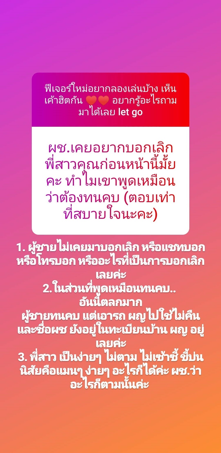 - ผู้ชายเคยอยากบอกเลิกพี่สาวคุณก่อนหน้านี้มั้ย ทำไมเขาพูดเหมือนว่าต้องทนคบ