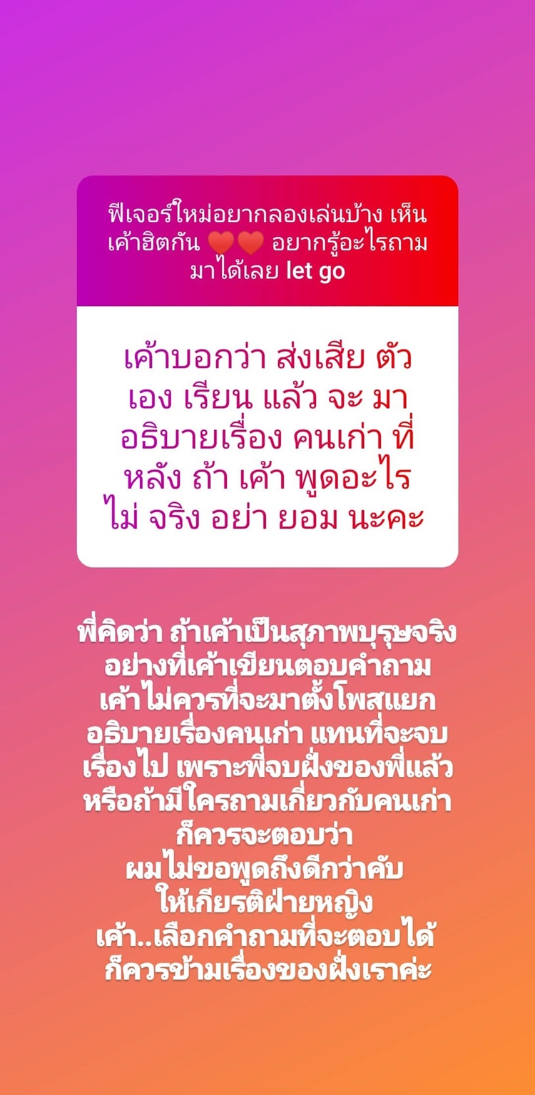- เค้าบอกว่าส่งเสียตัวเองเรียน แล้วจะมาอธิบายเรื่องคนเก่าทีหลัง ถ้าเค้าพูดอะไรไม่จริง อย่ายอมนะคะ