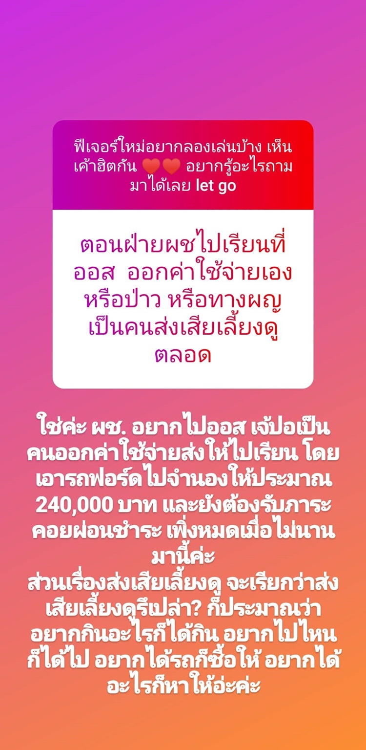 ใช่ค่ะ ผู้ชายอยากไปออสฯ เจ้ปอเป็นคนออกค่าใช้จ่ายส่งให้ไปเรียน โดยเอารถฟอร์ดไปจำนองให้ประมาณ 240,000 บาท และยังต้องรับภาระคอยผ่อนชำระ เพิ่งหมดเมื่อไม่นานมานี้ค่ะ