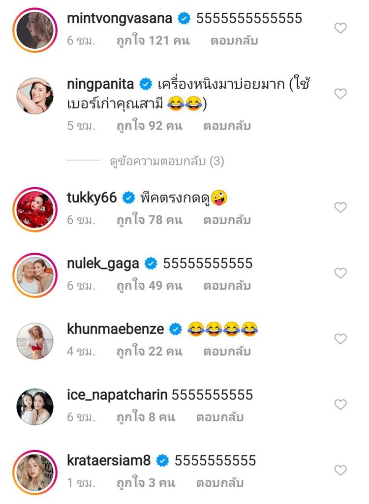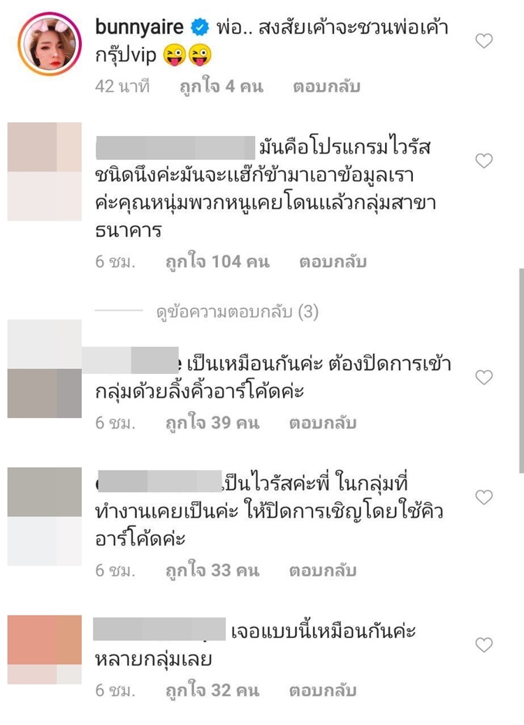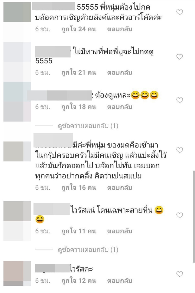 งานนี้ก็มีเพื่อน ๆ ดารา เข้ามาร่วมฮา บ้างก็แซวว่า พีคตรงกดดู ขณะเดียวกันก็มีแฟน ๆ เข้ามาร่วมแชร์ข้อมูลว่าเคยโดนเหมือนกัน เป็นไวรัสชนิดหนึ่งที่แฮกเข้ามาเอาข้อมูล จะต้องปิดการเชิญด้วย QR code เพื่อไม่ให้มีแบบนี้เข้ามาอีก