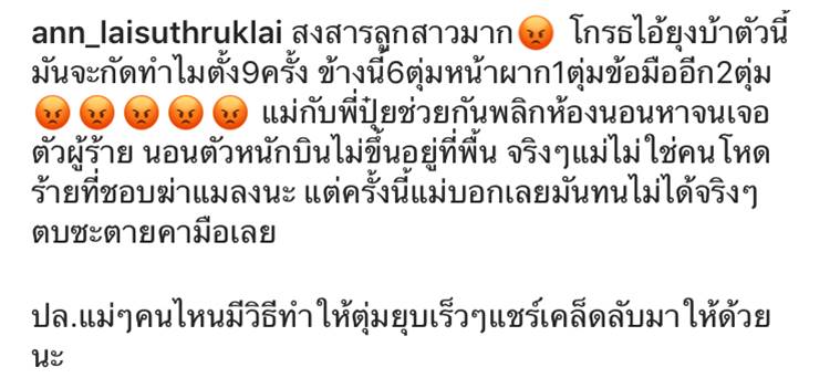 "สงสารลูกสาวมาก โกรธไอ้ยุงบ้าตัวนี้มันจะกัดทำไมตั้ง 9 ครั้ง ข้างนี้ 6 ตุ่ม หน้าผาก 1 ตุ่ม ข้อมืออีก 2 ตุ่ม แม่กับพี่ปุ๋ยช่วยกันพลิกห้องนอนหาจนเจอตัวผู้ร้าย นอนตัวหนักบินไม่ขึ้นอยู่ที่พื้น จริง ๆ แม่ไม่ใช่คนโหดร้ายที่ชอบฆ่าแมลงนะ แต่ครั้งนี้แม่บอกเลย มันทนไม่ได้จริง ๆ ตบซะตายคามือเลย ป.ล. แม่ ๆ คนไหนมีวิธีทำให้ตุ่มยุบเร็ว ๆ แชร์เคล็ดลับมาให้ด้วยนะ"