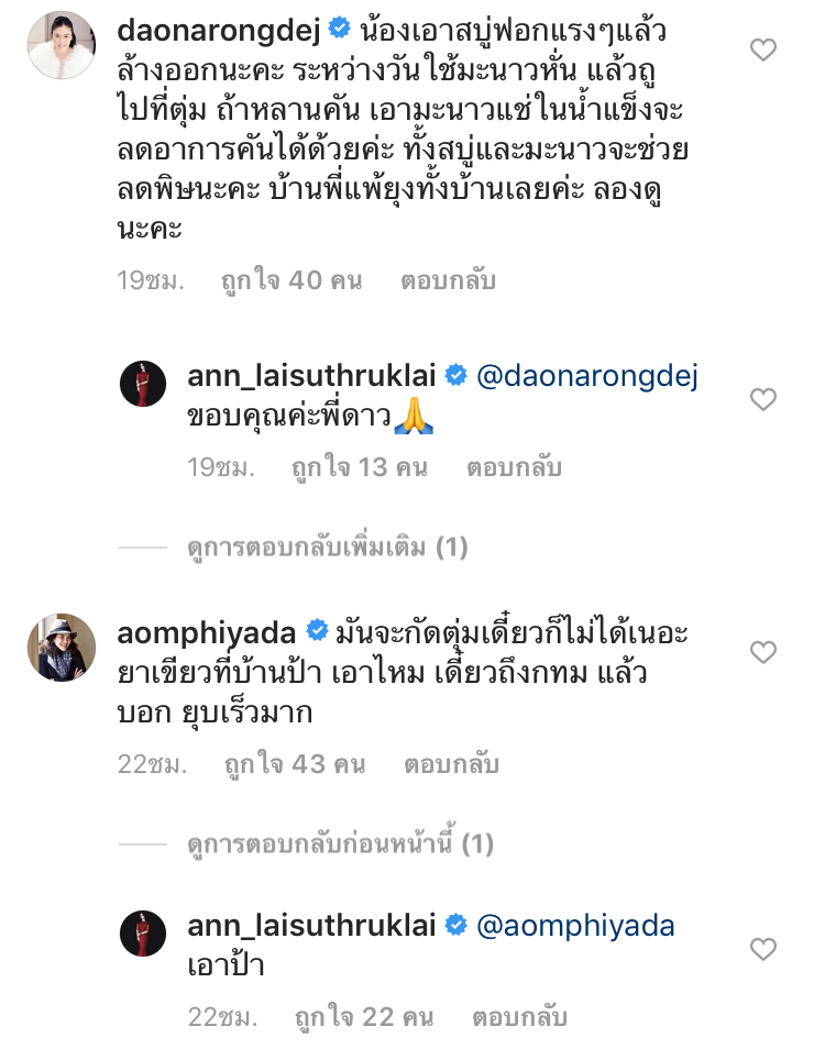 จากนั้นก็มีน้า ๆ ป้า ๆ เพื่อนของคุณแม่ เข้ามาคอมเมนต์เอ็นดูสาวน้อยริชากันเพียบ โดนกัดซะอ่วมเลย นอกจากนี้ยังมีเหล่าแม่ ๆ เข้ามาแชร์ประสบการณ์และวิธีแก้เช่นกัน เห็นถึงพลังของเหล่าแม่ ๆ สุด ๆ ไปเลย