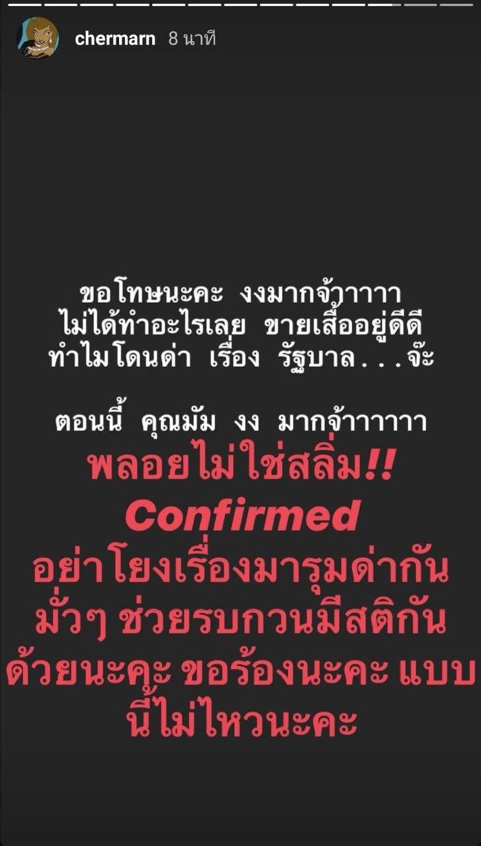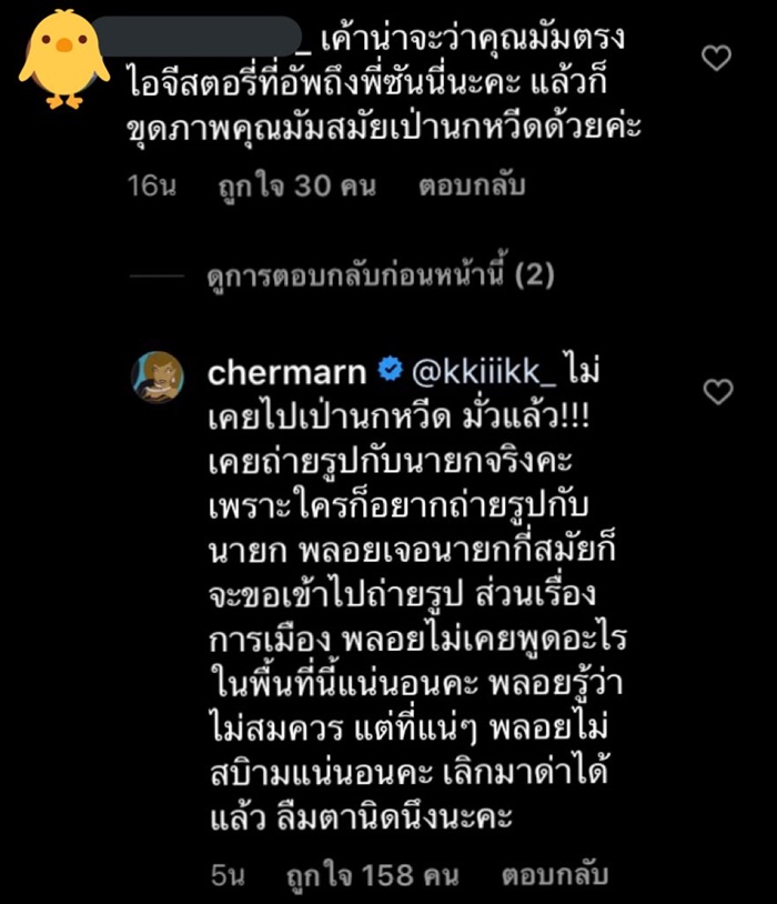อย่างไรก็ตาม บนไอจีของพลอย ยังมีคนเข้ามาให้กำลังใจพลอย และอย่าให้พลอยซีเรียสกับเรื่องนี้มาก เดี๋ยวมันก็ผ่านไป