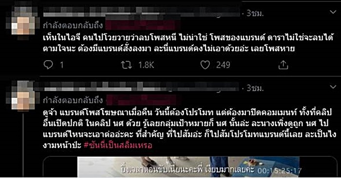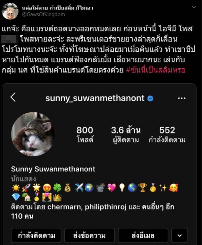 ลามไปถึงโฆษณาในยูทูบ ที่โดนคนแห่ไปถล่มคอมเมนต์ จนทางช่องต้องปิดคอมเมนต์ นอกจากนี้หลายคนยังมองว่า กลุ่มเป้าหมายของซันนี่คือกลุ่มวัยรุ่นนักศึกษา แต่ซันนี่กลับดูถูกกลุ่มเป้าหมายของตัวเอง สนับสนุนเผด็จการ ไม่เห็นหัวประชาชน อุตส่าห์คิดมาตลอดว่าซันนี่ เป็นคนที่มีวิสัยทัศน์ดี และการลบโพสต์ครั้งนี้ อาจจะไม่ได้ลบจริง ๆ แต่เป็นแค่การซ่อนโพสต์เพื่อให้เรื่องเงียบ พอเรื่องเงียบ ก็กลับมาโพสต์ใหม่ ซึ่งมองว่า เมื่อเรื่องราวกระทบปากท้องตัวเองเมื่อไหร่ ก็เพิ่งจะรู้ตัว