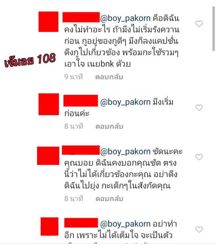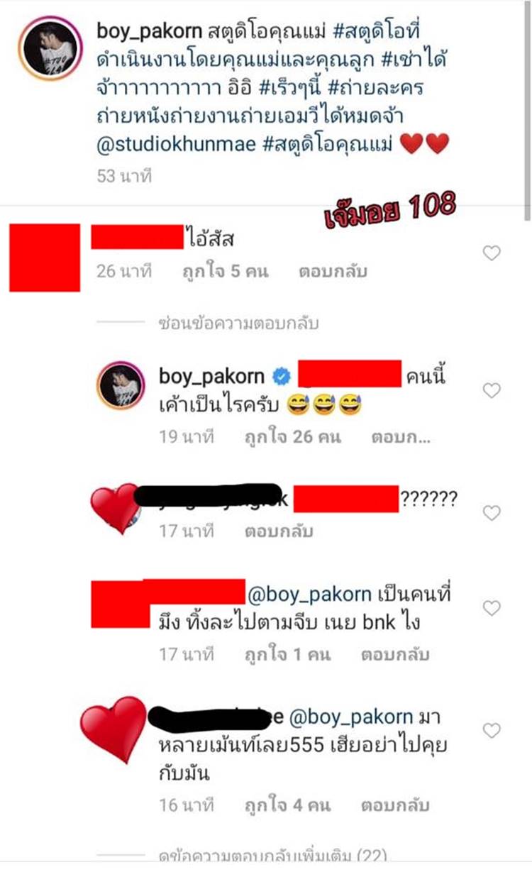 เรียกว่าอยู่ดี ๆ ก็งานเข้าอย่างจัง สำหรับพระเอกหนุ่ม บอย ปกรณ์ เพราะล่าสุด (1 กุมภาพันธ์ 2563) แฟนเพจ เจ๊มอย 108 ได้เผยภาพที่มีคนเข้าไปคอมเมนต์ป่วน IG บอย ปกรณ์ โดยเริ่มต้นด้วยคำด่าหยาบคาย จนพระเอกหนุ่มถึงกับงง และถามกลับว่า "คนนี้เค้าเป็นไรครับ"