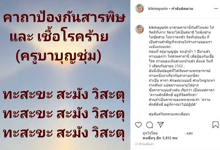 ช่วงนี้ โควิด 19 กำลังระบาดอย่างหนักทั่วโลก หลายคนต้องหวาดผวาไปตาม ๆ กัน ล่าสุด (2 มีนาคม 2563) นักแสดงสายบุญอย่าง กิ๊ก มยุริญ ก็ได้โพสต์ภาพคาถาป้องกันสารพิษและเชื้อโรคร้าย จากครูบาบุญชุ่ม ใน IG ระบุว่า "มาสวดคาถานี้กันดีไหมคะ ให้จิตมีที่เกาะ จิตจะได้เป็นสมาธิ ไม่ฟุ้งซ่าน ไม่ซัดส่าย ไม่หวาดกลัว จิตที่เข้มแข็ง ก็เป็นส่วนสำคัญที่จะช่วยให้ร่างกายของเราแข็งแรงนะคะ