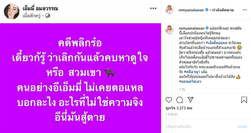 ล่าสุด (3 มีนาคม 2563) เอ็มมี่ อมลวรรณ ก็ได้ออกมาโพสต์เดือดถึงเหล่าชาวโซเชียลที่รุมต่อว่าตัวเองผ่านอินสตาแกรมส่วนตัวว่า "คดีพลิกเหรอ เดี๋ยวก็รู้ว่าเลิกกันแล้วคบหาดูใจ หรือ สวมเขา คนอย่างเอ็มมี่ไม่เคยตอแxล บอกละไง อะไรที่ไม่ใช่ความจริง อีนี่มันสู้ตาย" และ "แปลกดีเนอะ คนสมัยนี้เลือกปกป้องคนไม่รู้จักพอ เอาใจช่วยผู้หญิงที่เคยถูกสวมเขา ส่วนใครที่บอกว่า #เอ็มมี่ตอแหล ระวังเจอกับตัวแล้วจะลืมบ้านเลขที่ตัวเองนะจ๊ะ รู้ความจริงก่อนมั้ย แล้วค่อยด่า บางคนเมนต์เกินไปเหมือนเอ็มมี่ไปฆ่าพ่อฆ่าแม่หรือแย่งผัวคุณมายังไงยังงั้น เมนต์ไรก็ระวัง พ.ร.บ.คอมพิวเตอร์ กันด้วยนะจ๊ะ #คดีอาญา เด้อ ต่อให้ใช้รูปปลอมก้ไปหาถึงบ้านได้งับ #แรงแต่ไม่เลว"