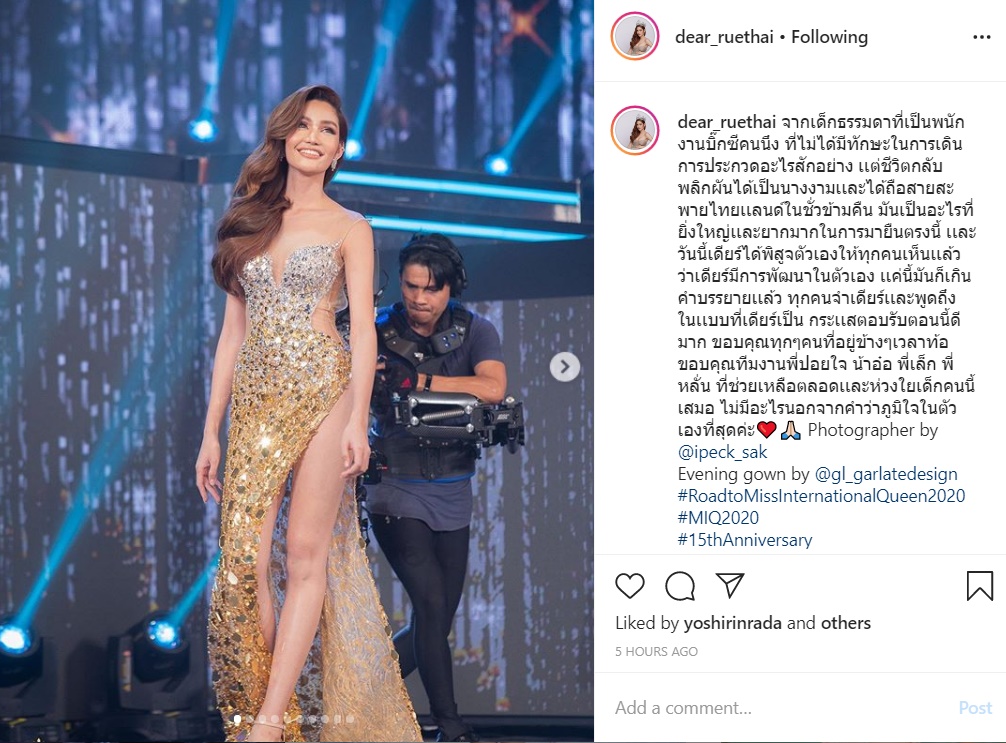 โดยล่าสุด (8 มีนาคม 2563) เดียร์ ฤทัยปรียา ก็ได้โพสต์ข้อความเปิดใจใน Instagram ถึงเส้นทางชีวิตของตนเอง จนมาถึงวันที่ได้ตำแหน่ง รองอันดับ 1 Miss International Queen 2020 ดังนี้...