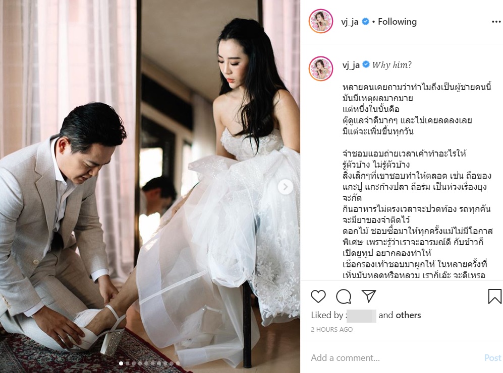 "Why him ? หลายคนเคยถามว่าทำไมถึงเป็นผู้ชายคนนี้ มันมีเหตุผลมากมาย แต่หนึ่งในนั้นคือ ตุ๊ดูแลจ๋าดีมาก ๆ และไม่เคยลดลงเลย มีแต่จะเพิ่มขึ้นทุกวัน จ๋าชอบแอบถ่ายเวลาเค้าทำอะไรให้ รู้ตัวบ้าง ไม่รู้ตัวบ้าง สิ่งเล็ก ๆ ที่เขาชอบทำให้ตลอด เช่น ถือของ แกะปู แกะก้างปลา ถือร่ม เป็นห่วงเรื่องยุงจะกัด กินอาหารไม่ตรงเวลาจะปวดท้อง รถทุกคันจะมียาของจ๋าติดไว้ ดอกไม้ ชอบซื้อมาให้ทุกครั้งแม้ไม่มีโอกาสพิเศษ เพราะรู้ว่าเราจะอารมณ์ดี กับข้าวก็เปิดยูทูบ อยากลองทำให้ เชือกรองเท้าชอบมาผูกให้ ในหลายครั้งที่เห็นมันหลุดหรือหลวม เราก็เอ๊ะ จะดีเหรอ อย่าเลย เกรงใจ ไม่ใช่ซีรีส์เกาหลีนะ แต่เค้ายืนยันว่าให้เราอยู่เฉย ๆ