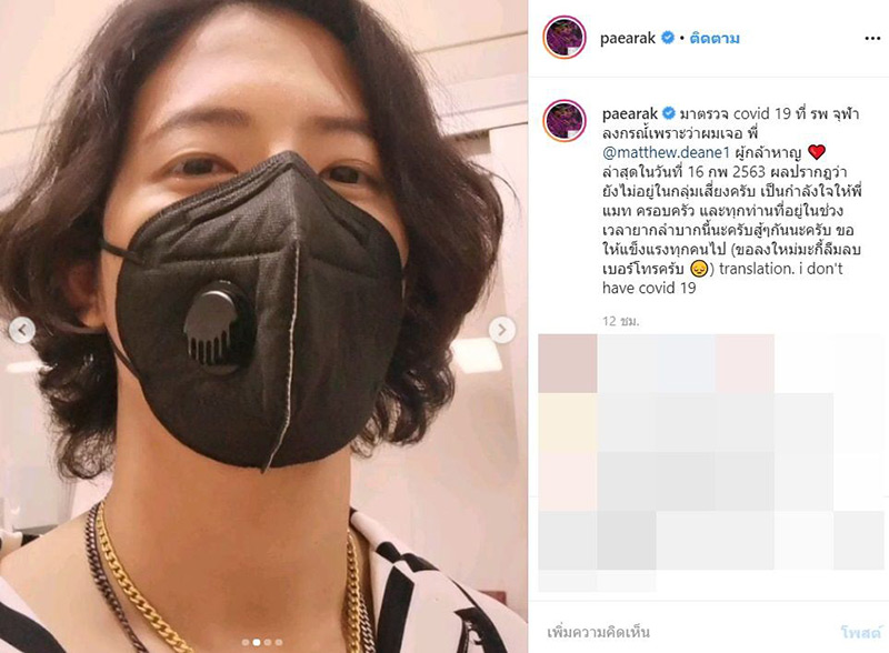 เพิ่งถ่ายรายการกับ แมทธิว เมื่อวันที่ 11 มีนาคม ที่ผ่านมา หลังทราบข่าว รับดำเนินการให้ครอบครัว แยกกักตัว 14 วัน และรีบไปโรงพยาบาลเพื่อตรวจเชื้อ จะแจ้งผลให้ทราบต่อไป