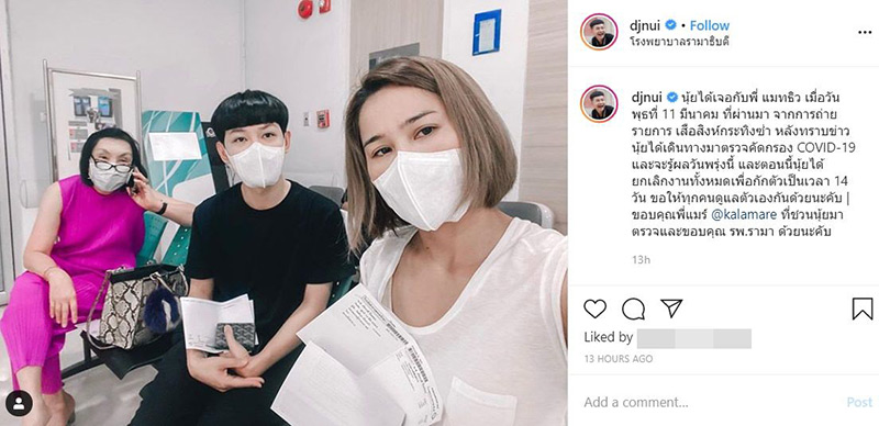 ถ่ายรายการเจอ แมทธิว เมื่อวันที่ 11 มีนาคม ที่ผ่านมา ยกเลิกงาน เดินทางไปตรวจที่โรงพยาบาล และเริ่มกักตัว 14 วันแล้ว