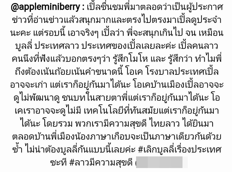 ทั้งนี้ แอปเปิ้ล สีสะเหงียน ได้โพสต์คลิปการรายงานข่าว COVID-19 ดังกล่าวลงใน Instagram พร้อมข้อความว่า "เปิ้ลชื่นชมพี่มาตลอดว่าเป็นผู้ประกาศข่าวที่อ่านข่าวแล้วสนุกมากและตรงไปตรงมาเปิ้ลดูประจำนะคะ แต่รอบนี้ เอาจริง ๆ เปิ้ลว่า พี่จะสนุกเกินไป จนเหมือนบูลลี่ประเทศลาว ประเทศของเปิ้ลเลยล่ะค่ะ เปิ้ลคนลาวคนหนึ่งที่ฟังแล้วบอกตรง ๆ ว่า รู้สึกโมโห และรู้สึกว่า ทำไมพี่ถึงต้องเน้นถ้อยเน้นคำขนาดนี้ โอเค โรงพยาบาลประเทศเปิ้ลอาจจะเก่า แต่เราก็อยู่กันมาได้นะ โอเคบ้านเมืองเปิ้ลอาจจะดูไม่พัฒนา ดูชนบทในสายตาพี่ แต่เราก็อยู่กันมาได้นะ โอเคเราอาจจะดูไม่มีเทคโนโลยีที่ทันสมัย แต่เราก็อยู่กันมาได้นะ โดยรวม พวกเรามีความสุขดี ไทยลาว ได้ยินมาตลอด บ้านพี่เมืองน้อง ภาษาเกือบจะเป็นภาษาเดียวกันด้วยซ้ำ ไม่น่าต้องบูลลี่กันแบบนี้เลยค่ะ #เลิกบูลลี่เรื่องประเทศซะที #ลาวมีความสุขดี"