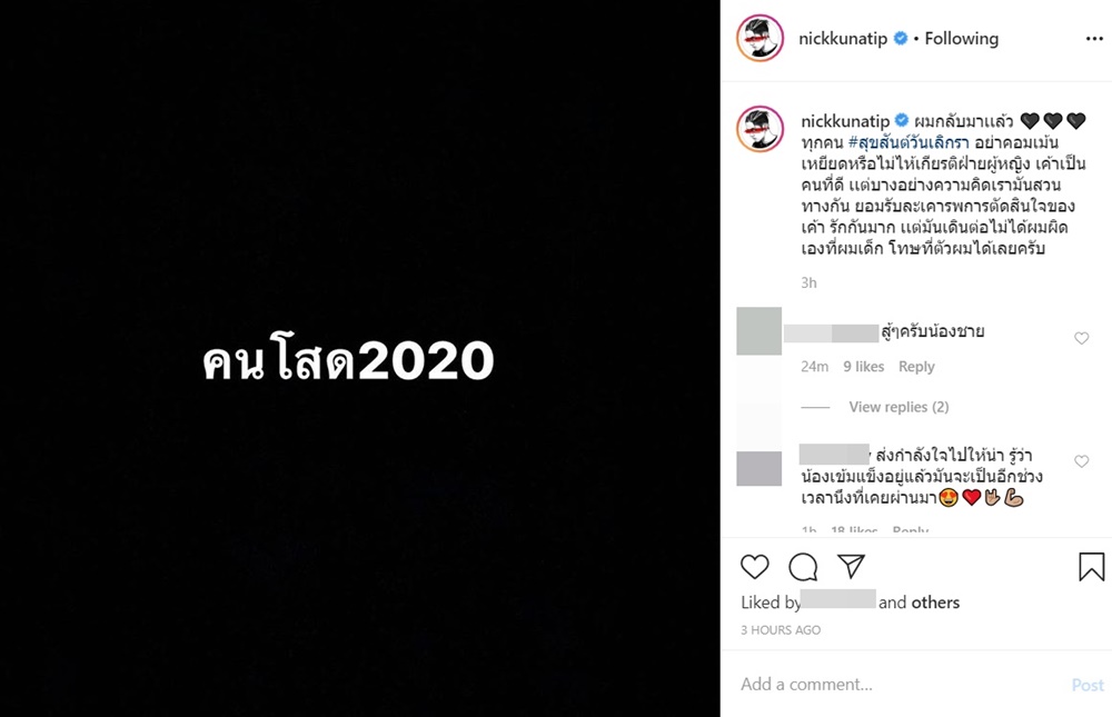 จากนั้น นิก คุณาธิป ก็โพสต์ภาพพื้นดำ มีข้อความสีขาวว่า "คนโสด2020" พร้อมแคปชั่น "ผมกลับมาแล้ว ทุกคน #สุขสันต์วันเลิกรา อย่าคอมเมนต์เหยียดหรือไม่ไห้เกียรติฝ่ายผู้หญิง เค้าเป็นคนที่ดี แต่บางอย่างความคิดเรามันสวนทางกัน ยอมรับและเคารพการตัดสินใจของเค้า รักกันมาก แต่มันเดินต่อไม่ได้ผมผิดเองที่ผมเด็ก โทษที่ตัวผมได้เลยครับ"