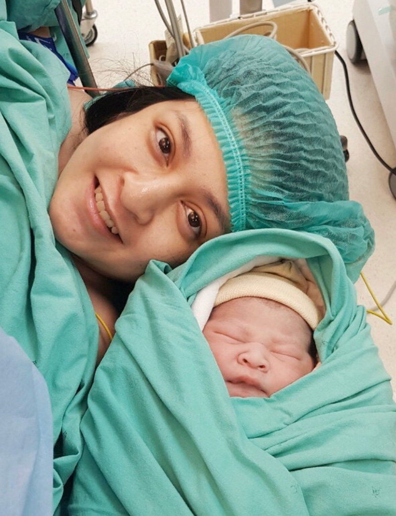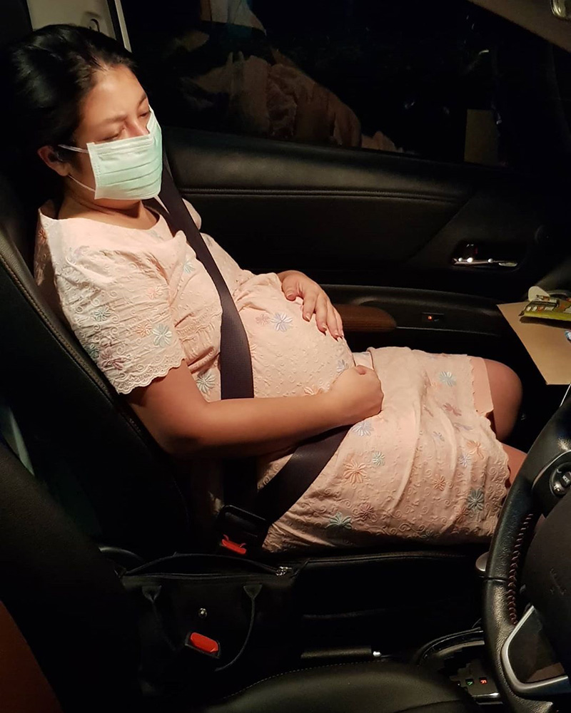 โดย สาวตรี เผยว่า "ณ วันที่มามี๊ปวดท้องคลอด ตอนตี 2 กว่า รู้สึกท้องแข็งเจ็บจนตื่น ก็เลยลงมาข้างล่างนั่งดูนาฬิกาว่าเจ็บจริงหรือเจ็บหลอก ไม่อยากไป-มา รพ. ระหว่างรอก็เตรียมอุปกรณ์ทำความสะอาดไปพลาง ๆ กระเป๋าปั๊มนม กระเป๋าเสื้อผ้าที่เตรียมไว้แล้วมาตั้งรวมกันรอป๊ายกขึ้นรถ รอถึงตี 4 กว่า ๆ คิดว่าเจ็บจริงแน่แล้ว ก็เลยโทร. หาห้องคลอด วางสายเสร็จไปเรียกปะป๊าอาบน้ำพาไป รพ. หน่อย จุ๊บลูกยอด 1 ที ระหว่างนั้น เริ่มเจ็บถี่ขึ้นเรื่อย ๆ 10 นาที 8 นาที 6 นาที