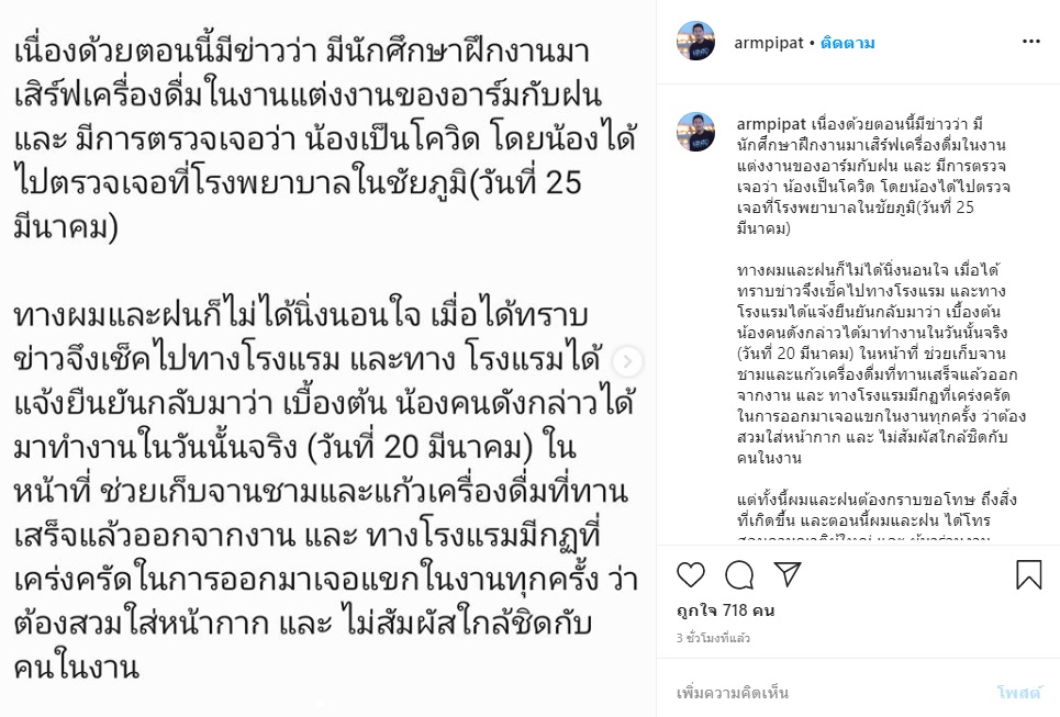 ทั้งนี้ อาร์มและฝนต้องกราบขอโทษถึงสิ่งที่เกิดขึ้น ตอนนี้อาร์มและฝน ได้โทร. สอบถามญาติผู้ใหญ่ และผู้มาร่วมงาน เบื้องต้นยังไม่มีท่านใดมีอาการแต่อย่างใด แต่เพื่อความปลอดภัย ตอนนี้ผ่านมาแล้ว 7 วัน ทั้งอาร์มและฝนจะกักตัวเองอีกเป็นเวลา 7 วัน เพื่อให้ครบเป็นเวลา 14 วัน เพื่อความปลอดภัยและความสบายใจของทุก ๆ คน และต้องขอรบกวนพี่ ๆ เพื่อน ๆ ทุกท่าน ที่มาร่วมงาน กักตัวเองเพื่อดูอาการ หากมีไข้สูง มากกว่า 37.5 ติดต่อกัน 3-4 วัน มีอาการไอ มีเสมหะ ปวดเมื่อยตามเนื้อตัว หายใจถี่ หอบ หายใจไม่ทัน กรุณาไปตรวจและรบกวนฝากแจ้งกลับมาที่อาร์มและฝนด้วย เพื่อความปลอดภัยของทุกท่าน
