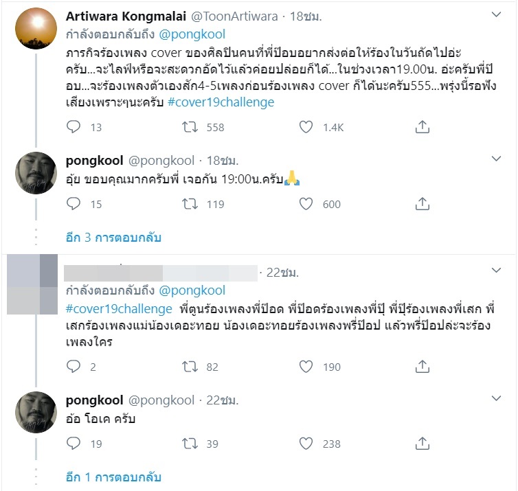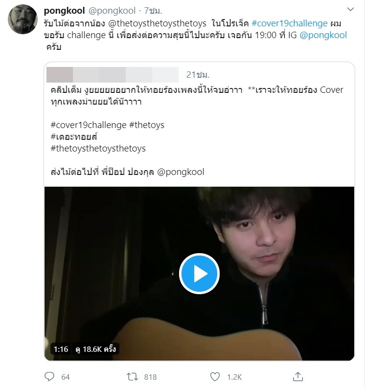 โดยทาง The Toys ได้ร่วมโปรเจ็กต์ #cover19challenge ด้วยการปล่อยคลิปมาแบบสั้น ๆ ร้องเพลงของ ป๊อบ ปองกูล ก่อนส่งต่อภารกิจให้นักร้องรุ่นพี่ ซึ่งก็มีแฟน ๆ นำคลิปนี้ไปแท็กหาพี่ป๊อบ ในทวิตเตอร์ ซึ่งตอนแรกเจ้าตัวก็เป็นงง เลยโพสต์ถามว่า "มันคืออะไรน้า อธิบายให้ฟังหน่อยจิ"