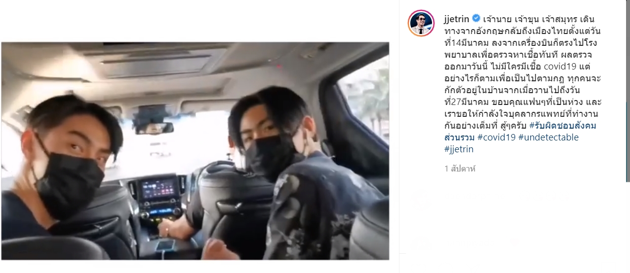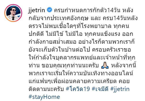 เจ เจตริน เผย เจ้านาย เจ้าขุน เจ้าสมุทร กักตัวครบ 14 วันแล้ว หลังกลับจากอังกฤษ ทุกคนแข็งแรง ไม่มีป่วย โควิด 19 แต่ก็จะเก็บตัวอยู่ในบ้านเหมือนเดิม พร้อมทั้งส่งกำลังใจให้ทีมแพทย์