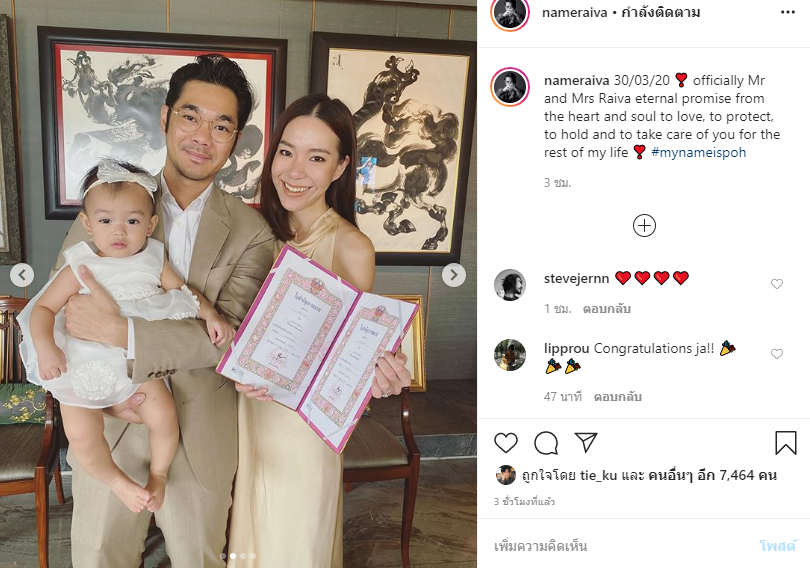 "30/03/20 officially Mr and Mrs Raiva eternal promise from the heart and soul to love, to protect, to hold and to take care of you for the rest of my life #mynameispoh" (30/03/20 นายและนาง ไรวา อย่างเป็นทางการ สัญญานิรันดร์จากหัวใจและวิญญาณที่จะรัก ปกป้อง และดูแลคุณตลอดชีวิตของผม)