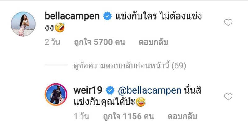 แต่ดูท่าชาเลนจ์ครั้งนี้จะไม่ค่อยถูกใจหวานใจอย่าง เบลล่า ราณี สักเท่าไร เพราะเจ้าตัวรีบเข้ามาคอมเมนต์เบรกทันทีว่า "แข่งกับใคร ไม่ต้องแข่งงง..." ซึ่งทาง หนุ่มเวียร์ ก็ได้เข้าไปคอมเมนต์ตอบว่า "นั่นสิ แข่งกับคุณได้ป่ะ... " จนแฟนคลับเวียร์เบลล่าเข้ามาฮากันเป็นแถว ๆ