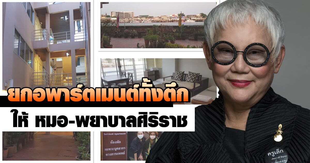 ล่าสุด (31 มีนาคม 2563) มีรายงานว่า ครูเล็ก ภัทราวดี มีชูธน ศิลปินแห่งชาติสาขาศิลปะการแสดง (ละครเวที ภาพยนตร์) และผู้ก่อตั้งมูลนิธิละครธรรมะในพระสังฆราชูปถัมภ์ ได้โพสต์เฟซบุ๊ก Mejudhon Patravadi ขอเป็นส่วนหนึ่งในการช่วยบรรเทาความเหนื่อยล้าให้กลุ่มแพทย์ พยาบาลของโรงพยาบาลศิริราช ด้วยการยกอพาร์ตเมนต์ PSB1 ทั้งตึก ซึ่งอยู่ใกล้โรงพยาบาล ให้เป็นที่พักผ่อนสำหรับใครที่ไม่สามารถกลับบ้านได้ จนกว่าภารกิจสิ้นสุด เพื่อตอบแทนความเสียสละที่เป็นด่านหน้าสู้โควิด 19