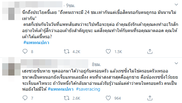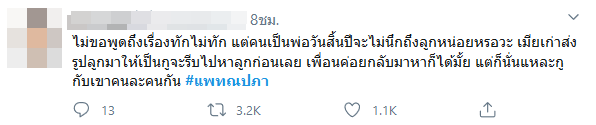 นอกจากนี้ยังมีชาวเน็ตพูดถึงประเด็นเรื่องลูกด้วยว่า คนเป็นพ่อในวันสิ้นปีจะไม่คิดถึงหรืออยากอยู่กับลูกชายเลยเหรอ การที่ แพท ส่งรูป น้องเรซซิ่ง ไปให้ ก็เหมือนจะสื่อว่าน้องรอจะได้เจอกับพ่อ ถ้าเป็นคนที่รักลูกเขาก็รีบไปหาลูกทันที เพื่อนหรือคนอื่น ๆ ค่อยกลับมาหาก็ได้