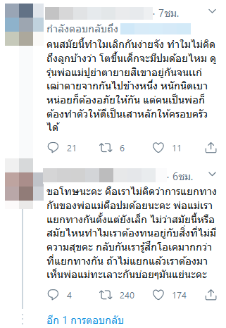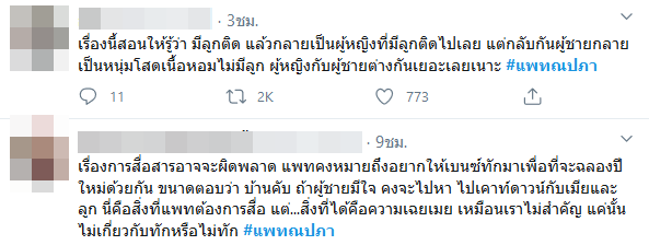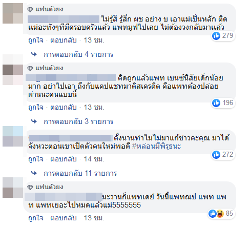 ชาวเน็ตหลายคนยังมองว่าการที่ แพท ตัดสินใจเดินออกมานั้นคงถึงที่สุดแล้วจริง ๆ เพราะที่ผ่านมาไม่ได้รับความชัดเจนอะไรเลย และยังชื่นชมที่เจ้าตัวทำหน้าที่แม่ได้เป็นอย่างดีมาโดยตลอดด้วย