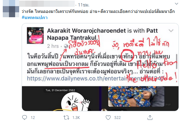 อีกด้านก็มองว่า เรื่องนี้อาจเป็นการสื่อสารที่ผิดพลาด การทักของ แพท อาจจะหมายถึง ทักให้ชวนไปร่วมฉลองวันปีใหม่ด้วยกัน แต่สิ่งที่ได้รับกลับมาคือการเฉยเมย มองว่าหากฝ่ายชายยังมีใจให้กันอยู่ ก็คงจะไปหาและเคานต์ดาวน์ด้วยกันแล้ว แม้เบนซ์จะทักไปหาแพท และส่งรูปว่าอยู่กับครอบครัว แต่ก็ไม่ชวนแพทไปร่วมด้วย ซึ่งมองว่า แพท อาจจะมีความน้อยใจในจุดนี้ บางคนก็มองว่า ทัก ในที่นี้อาจจะรวมไปถึงการพูดคุยเรื่องความชัดเจนในความสัมพันธ์ ไม่ใช่การทักไปคุยกันเรื่องเคานต์ดาวน์เพียงอย่างเดียว