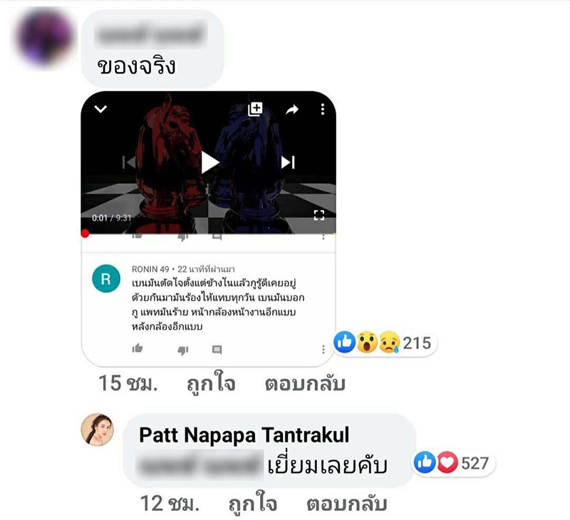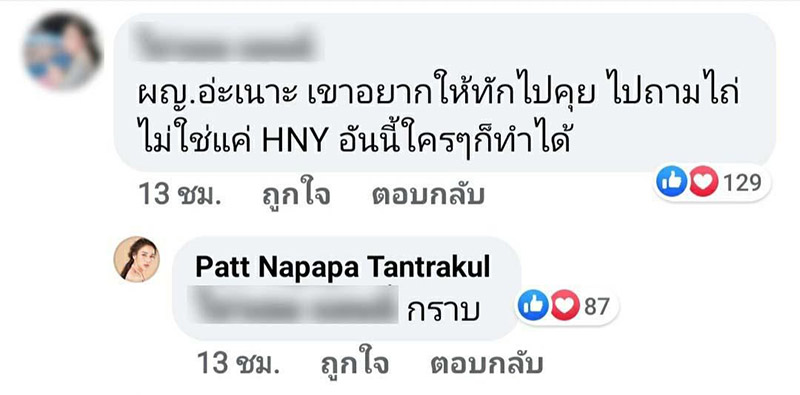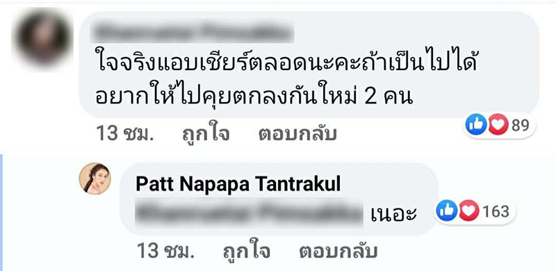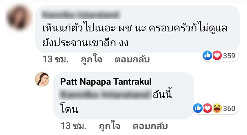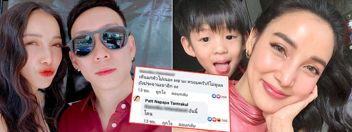 และที่เด็ดสะระตี่ ร้อนแรงแบบละสายตาไม่ได้ นั่นก็คือคอมเมนต์ที่บอกว่า "เห็นแก่ตัวเนอะ ผู้ชายนะ ครอบครัวก็ไม่ดูแล ยังประจานเขาอีก งง" และ แพท ก็ได้ตอบไปว่า "อันนี้โดน"