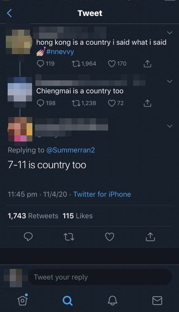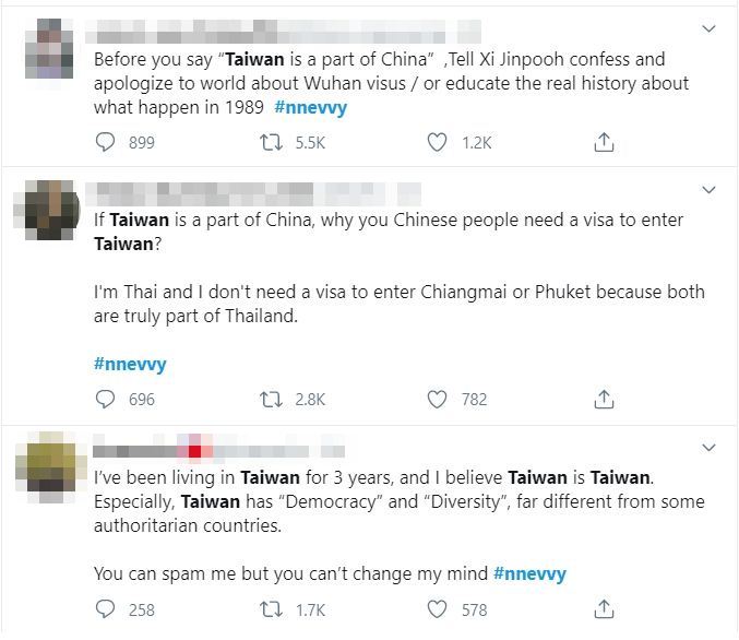 - ชาวโซเชียลไต้หวันและฮ่องกง ได้เข้ามาเสริมทัพ พูดถึงประเด็นเรื่องประวัติศาสตร์ของไต้หวันและฮ่องกง ที่มั่นใจว่าในขณะนี้พวกเขาไม่ได้เป็นส่วนหนึ่งประเทศจีนอย่างแน่นอน โดยเฉพาะชาวไต้หวันที่ไม่พอใจอย่างมาก วิจารณ์แฟนคลับจีนเรื่องที่มาต่อว่านิว ที่บอกว่าเป็นสาวไต้หวัน ไม่ใช่สาวจีน เพราะก็ถูกต้องแล้ว ไต้หวันไม่ใช่จีน มีประชาธิปไตย เป็นอิสระจากจีน