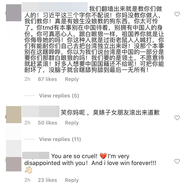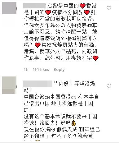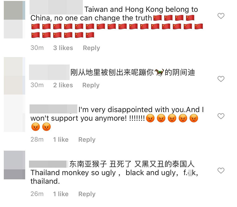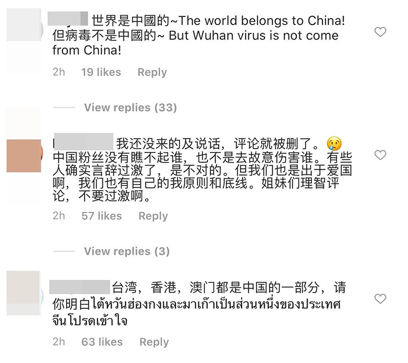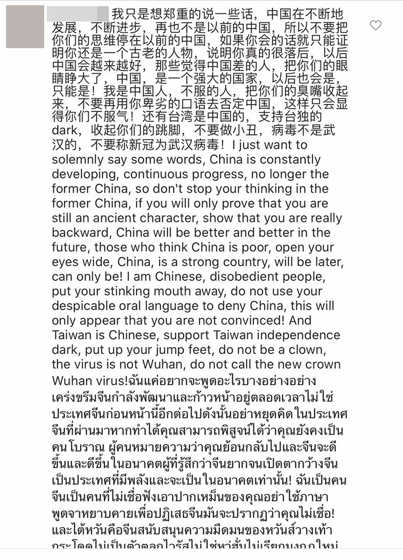 แฟนคลับจีนยังกล่าวว่า การกระทำของนิว เป็นการจุดชนวนแค้น เพราะเธอไม่มีสามัญสำนึกในการแสดงความคิดเห็นในประเด็นที่อ่อนไหว มั่นใจว่าจีนไม่ใช่ผู้ที่คิดปล่อยเชื้อไวรัสตามการกล่าวหาลอย ๆ ที่ไม่มีหลักฐานนั่น พร้อมทั้งเรื่องที่ว่า ทั้งฮ่องกงและจีน เป็นส่วนหนึ่งของจีนแผ่นดินใหญ่ ซึ่งคนทั่วโลกต่างรับรู้และเข้าใจ และให้การเคารพประเทศจีน แต่เธอผู้ซึ่งแฟนหนุ่มมาโด่งดังที่จีน กลับมาแสดงความหยาบคายที่น่าอัปยศอดสูเช่นนี้ ถ้าเป็นเช่นนั้นก็ขอให้ไบร์ทกลับไปที่ประเทศไทย