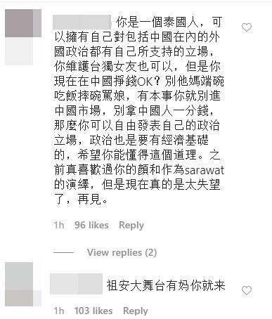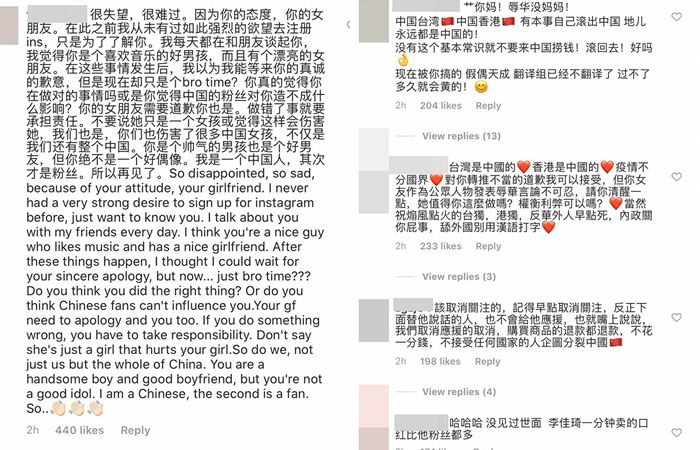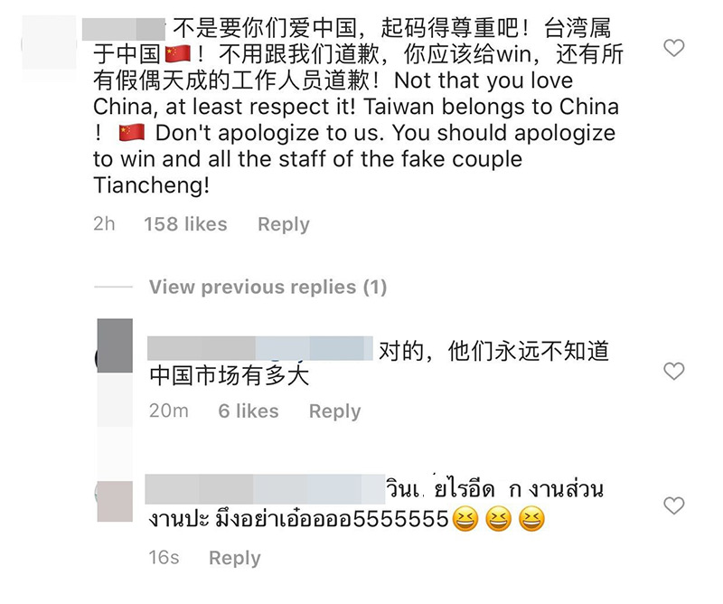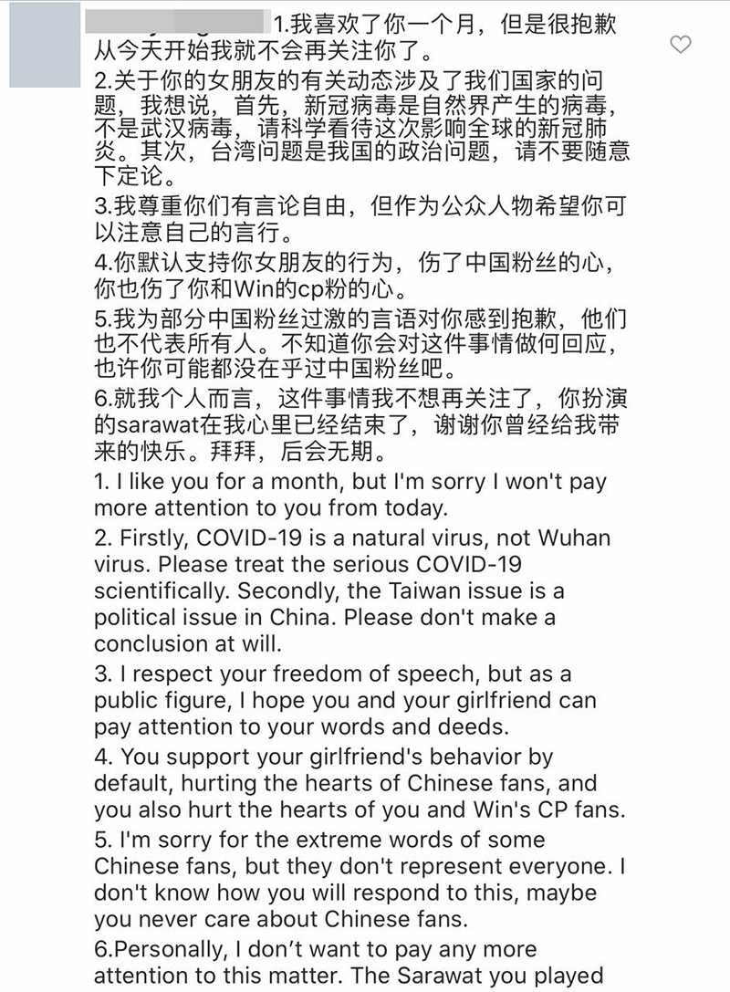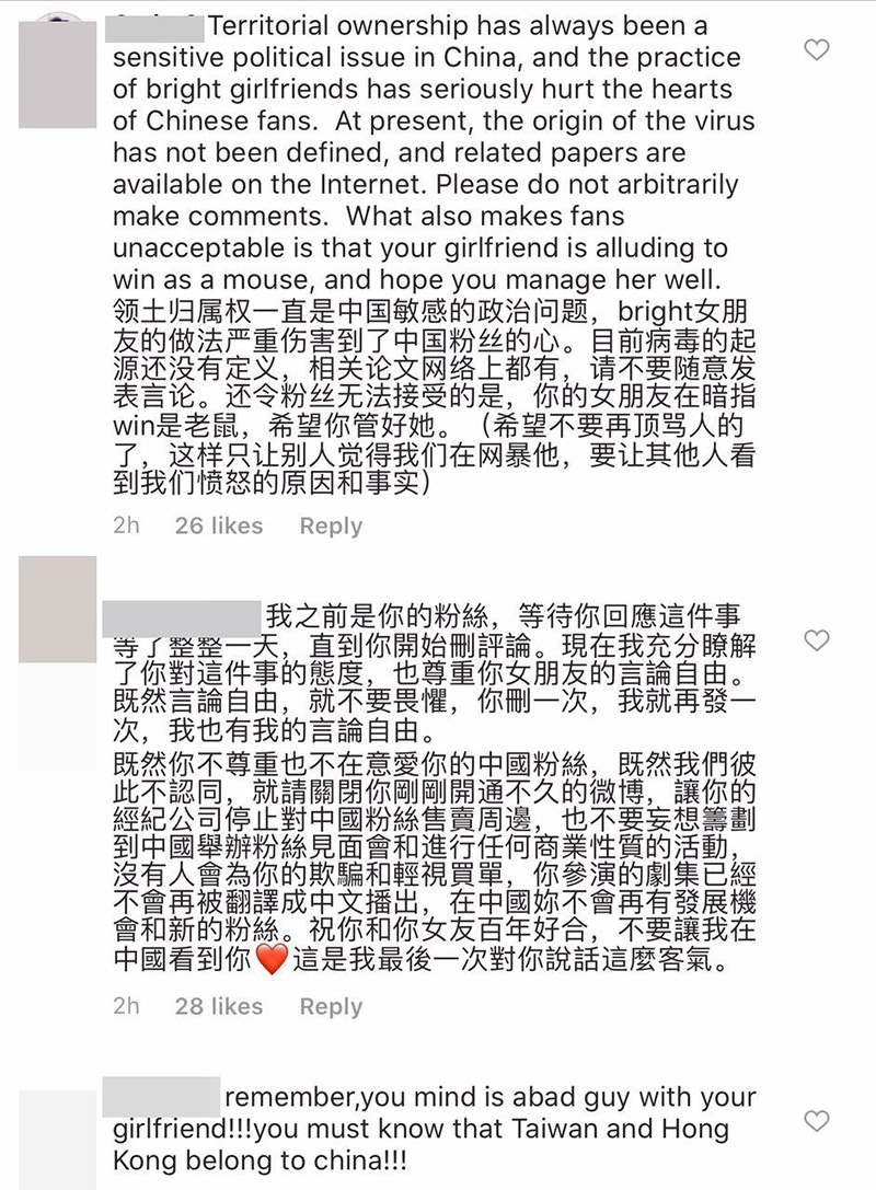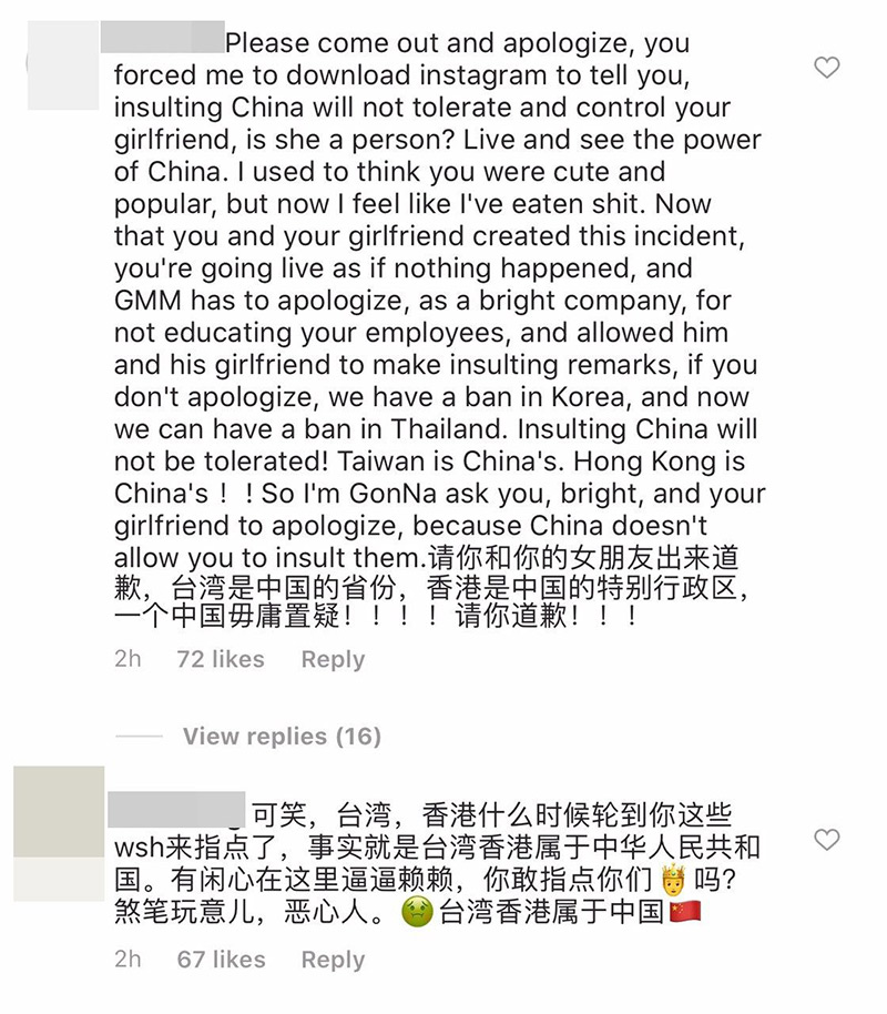 ทั้งนี้ แฟนคลับจีนยังตำหนิว่า การแสดงความคิดเห็นอย่างเสรีเป็นเรื่องพึงชอบ แต่การเคารพประเทศกันและกันเป็นเรื่องพื้นฐานที่คนทั่วไปควรจะมีเช่นเดียวกัน ในทางกลับกัน แฟนสาวของไบร์ทกลับมาเป็นคนทำลายอนาคตของเขาเสียเอง เป็นเรื่องที่น่าละอายใจอย่างยิ่ง ในขณะเดียวกัน ไบร์ทก็ให้การซัพพอร์ตแฟนสาว แสดงถึงการเหยียบย่ำทำร้ายหัวใจของแฟนคลับจีน และไม่แคร์พวกเขา พวกเขาจึงขอประกาศว่า หลังจากนี้จะขอเลิกสนับสนุน จะไม่ให้ความสนใจไบร์ทอีกต่อไป พอกันที