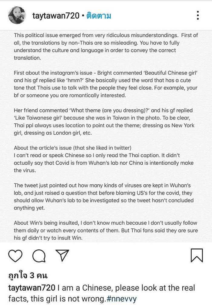- อินสตาแกรมที่ ไบร์ท เข้าไปโพสต์ว่า นิว เหมือนสาวจีนเลย ซึ่งข้อความที่ นิว ตอบกลับคือ "รายง่ะ" คำนี้นั้นมีการแปลที่ทำให้คนจีนเข้าใจผิด คิดว่าเธอหมายถึง "What - อะไร ?" กึ่งไม่พอใจที่ถูกพูดแบบนั้น แต่จริง ๆ แล้วเป็นการพูดแบบน่ารัก ๆ กับแฟน และที่บอกว่าน่ารักเหมือนสาวไต้หวันนั้น เป็นเพราะตอนนั้นเธออยู่ที่ไต้หวัน ไม่ใช่ว่าเธอสนับสนุนการแยกประเทศ