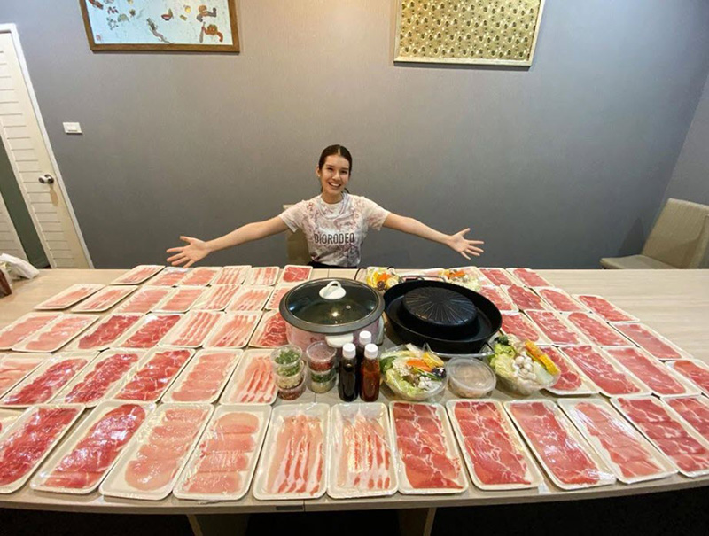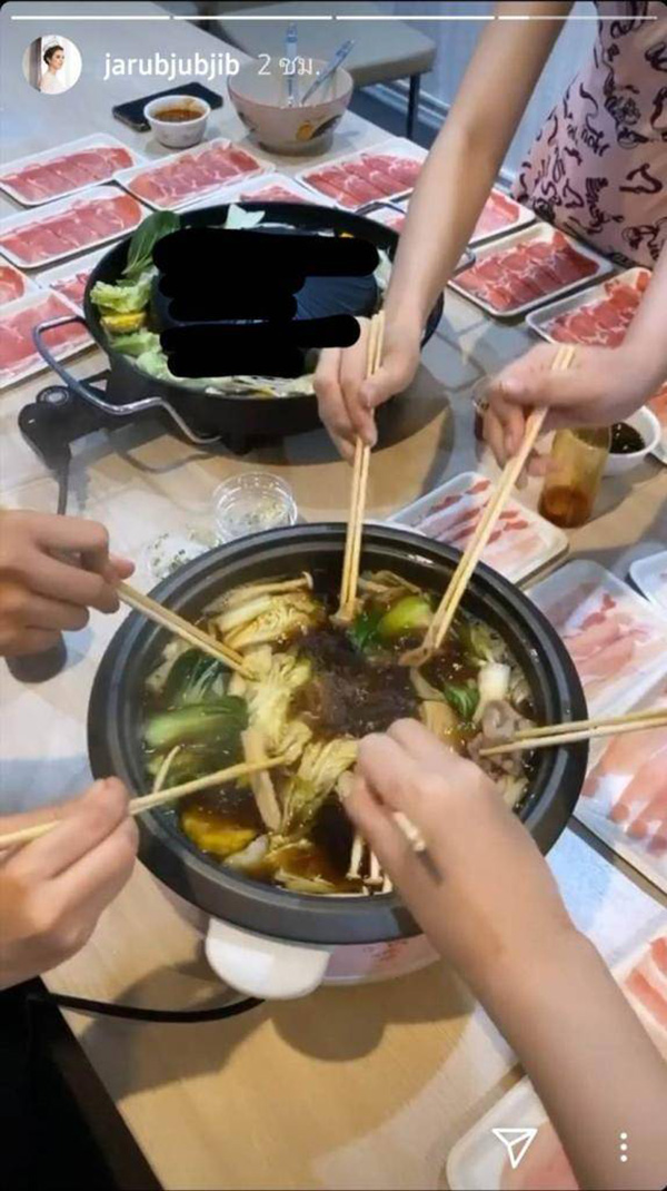 ขณะเดียวกัน จุ๊บจิ๊บ ได้ลงภาพอาหารอย่าง ชาบู ที่ได้รับสปอนเซอร์มาช่วยเหลือกิจกรรมนี้ ชนิดที่วางกันเต็มโต๊ะหลายสิบจานเลยทีเดียว ซึ่งจุ๊บจิ๊บ ได้ลงสตอรี่เป็นภาพที่ร่วมกันกินชาบูในหม้อเดียวกัน รวม 5 คน งานนี้ทำเอาหลายคนหิวตามกันเป็นแถบ ๆ