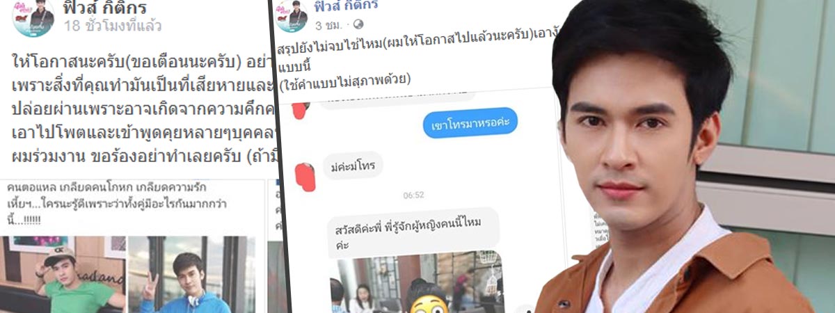 งานเข้าเต็ม ๆ เลยทีเดียว สำหรับ ฟิวส์ กิติกร พระเอกละครแนวจักร ๆ วงศ์ ๆ ของทางช่อง 7 และยังเป็นนักร้องลูกทุ่งเจ้าของเพลง โสดอยู่เด้อ หลังโดนสาวรายหนึ่งออกมาแฉว่า ฟิวส์ แอบคบกับแฟนคลับ และมีลูกด้วยกัน 2 คน แต่ถูกฟิวส์หลอกและโกหก ทำให้ความรักจบลงแบบไม่แฮบปี้ พร้อมทั้งยังได้ส่งแชตไปให้บรรดาแฟนคลับของฟิวส์หลายต่อหลายคนดู