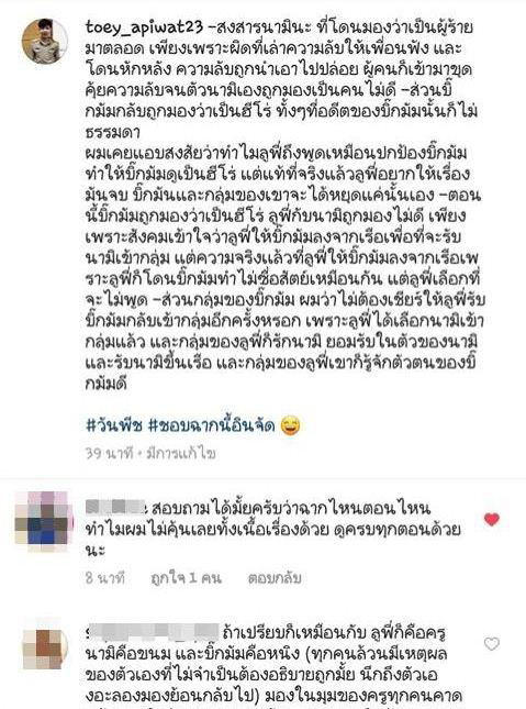 หลังโพสต์แพร่ออกไป มีชาวเน็ตเข้ามาถามว่าที่เล่ามาเป็นฉากไหนในวันพีซ เพราะดูครบทุกตอนไม่เคยเห็นมีประเด็นนี้ ทำให้ต่างตีความว่าครูเต้ยกำลังเล่าหนังชีวิตจริงอยู่ ลูฟี่ คือ ครูเต้ย, บิ๊กมัม คือ หนิง แฟนเก่าครูเต้ย และนามิ คือ ขนม แฟนใหม่ของครูเต้ย