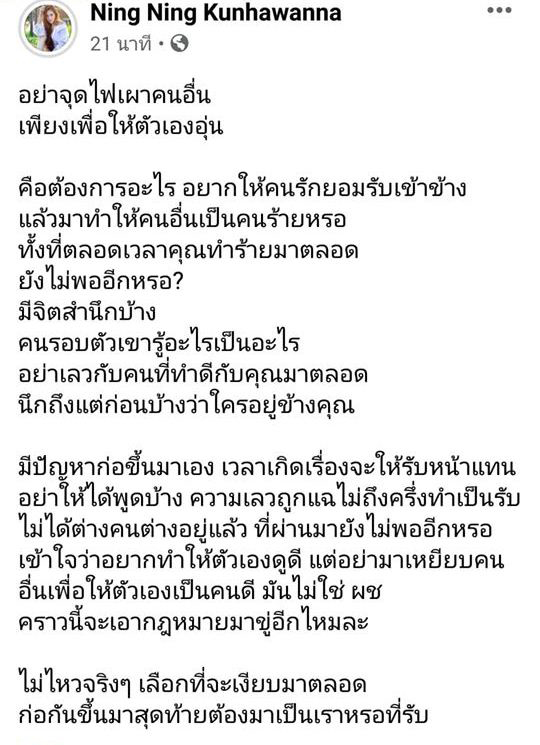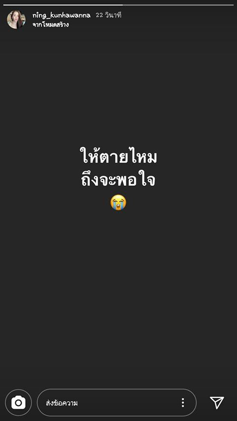 หลังจากนั้น หนิง แฟนเก่าครูเต้ย ได้ลงไอจีสตอรี่เป็นข้อความว่า "ให้ตายไหมถึงจะพอใจ" พร้อมกับโพสต์เฟซบุ๊กทำนองว่า อย่าจุดไฟเผาคนอื่น เพียงเพื่อให้ตัวเองอุ่น ต้องการอะไร อยากให้คนรักยอมรับเข้าข้างแล้วมาทำร้ายคนอื่นเหรอ ตลอดเวลาคุณทำร้ายมาตลอด คนรอบตัวรู้ดี อย่าเลวกับคนที่ทำดีกับคุณมาตลอด ปัญหาก็ก่อขึ้นมาเอง เวลาเกิดเรื่องจะให้รับหน้าแทน ความเลวถูกแฉไม่ถึงครึ่งเลยทำเป็นรับไม่ได้ เข้าใจว่าอยากทำให้ตัวเองดูดี แต่อย่ามาเหยียบคนอื่น มันไม่ใช่ผู้ชาย คราวนี้จะเอากฎหมายมาขู่อีกไหม ไม่ไหวจริง ๆ เลือกเงียบมาตลอด สุดท้ายต้องมารับผิดเหรอ
