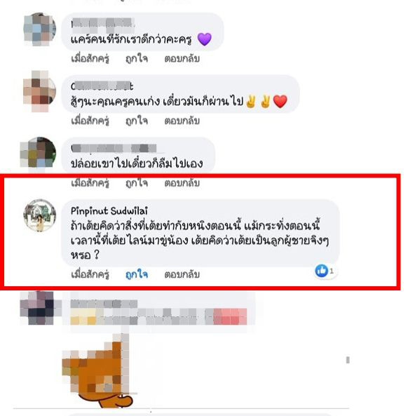 จากนั้นมีผู้หญิงคนหนึ่งเข้ามาคอมเมนต์ ซึ่งชาวเน็ตบอกว่าเป็นพี่สาวของหนิง "สิ่งที่เต้ยทำกับหนิงตอนนี้ เต้ยไลน์มาขู่น้อง เต้ยคิดว่าเป็นลูกผู้ชายจริง ๆ เหรอ" ต่อมาครูเต้ยก็ลบโพสต์ดังกล่าวทิ้งไปอีก